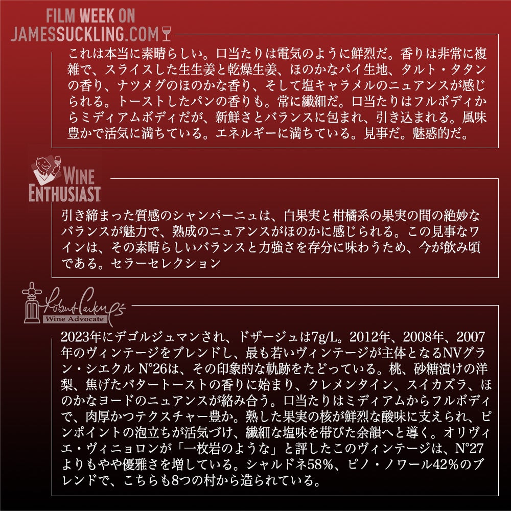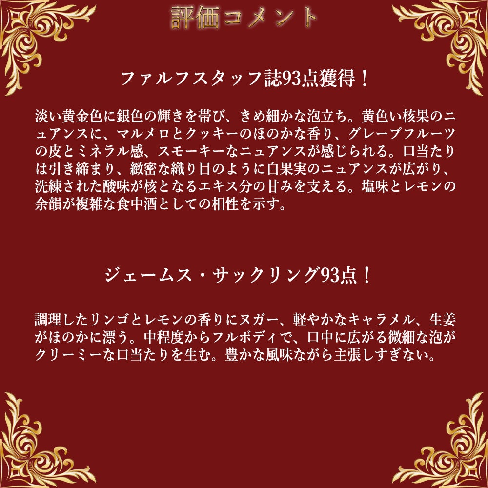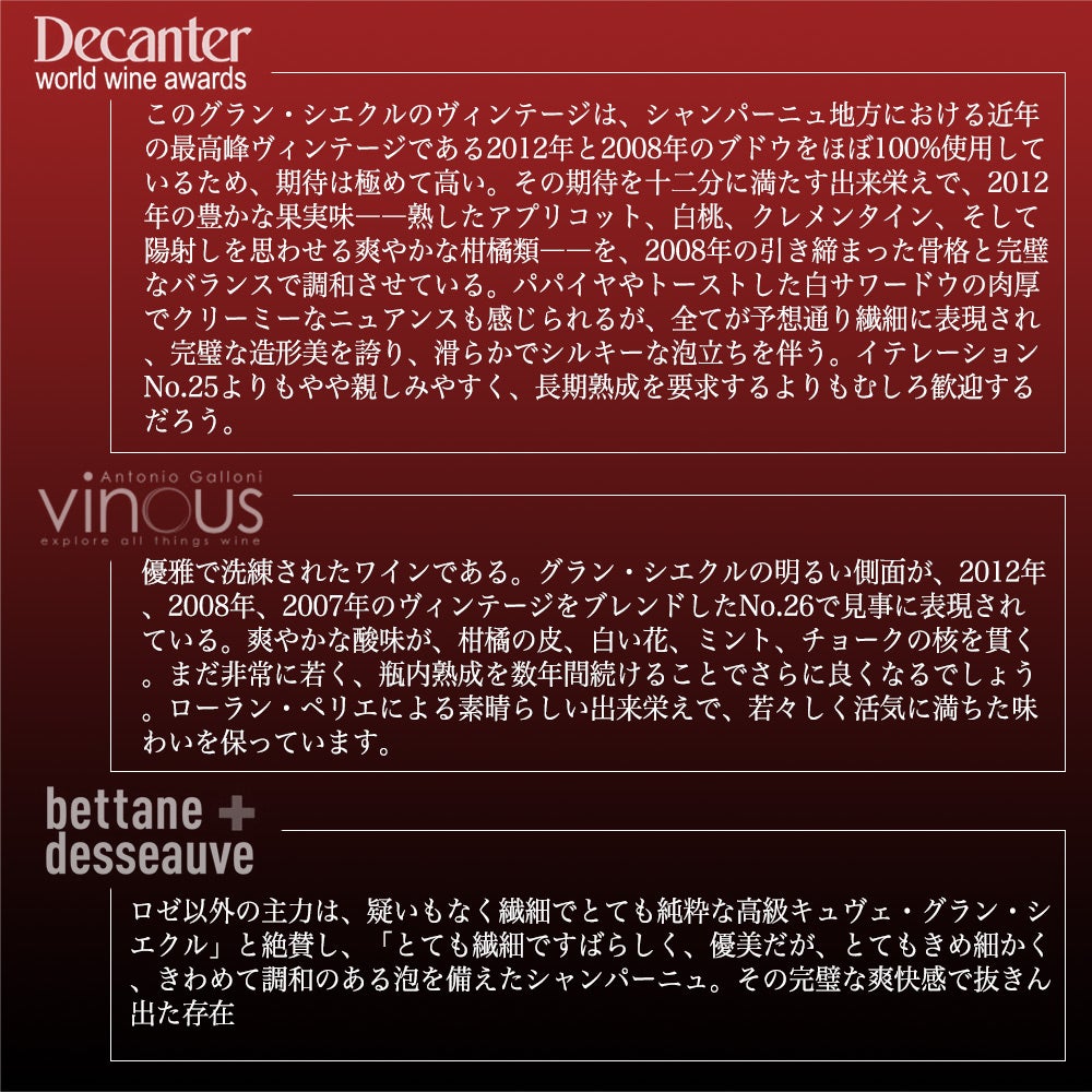 他の画像を見る ローラン ペリエ シャンパーニュ グラン シエクル グラン キュヴェ ブリュット N.026 正規品 ジェームス サックリング100点満点Laurent-Perrier Champagne Grand Siecle Grande Cuvee Brut N.O26 AOC Champagne スパークリング シャンパン フランス 辛口 当店特別価格 ¥ 26,104 税込 カートに入れる お気に入りに登録する