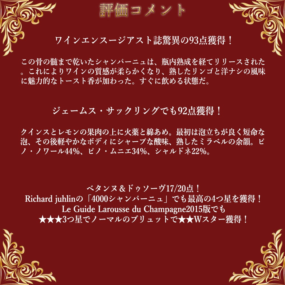 他の画像を見る ラミアブル シャンパーニュ エクラ デトワール グラン クリュ 特級 ロゼ ブリュット 生産者元詰(ラミアブル家元詰) 手摘み100% 正規品Lamiable Champagne Eclat D'etoiles Grand Cru Rose Brut スパークリング シャンパン ロゼ フランス 辛口 当店特別価格 ¥ 8,151 税込 カートに入れる お気に入りに登録する