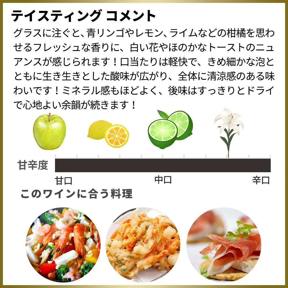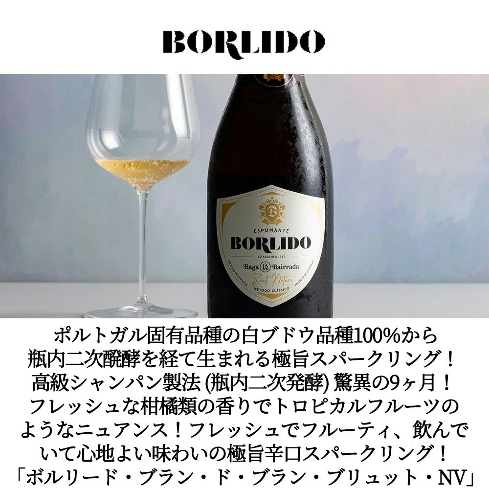 他の画像を見る ボルリード ブラン ド ブラン ブリュット NV ヴィーニョ エスプマンテ デ クアリダーデ 高級シャンパーニュ製法 (瓶内二次発酵) 9ヶ月以上Borlido Blanc de Blancs Bruto NV Borlido, Lda スパークリング ポルトガル 辛口 当店特別価格 ¥ 1,765 税込 カートに入れる お気に入りに登録する