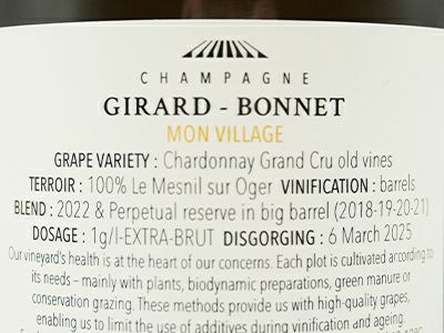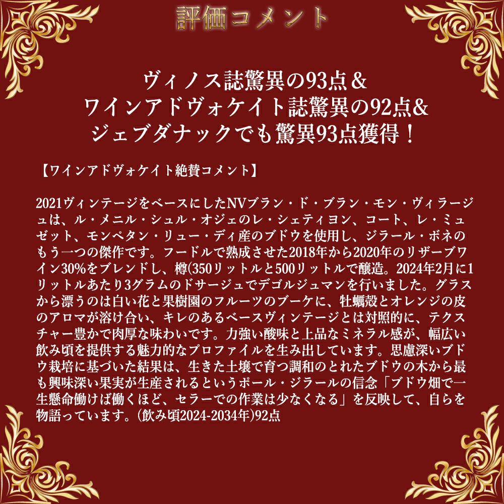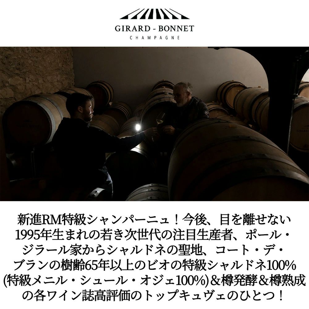 他の画像を見る ジラール ボネ シャンパーニュ シャルドネ GC特級 モン ヴィラージュ VV NV (2022年主体) RM 生産者元詰 (ポール ジラール家)Girard Bonnet Champagne Blanc de Blancs Extra 白ワイン シャンパン フランス 辛口 当店特別価格 ¥ 11,096 税込 カートに入れる お気に入りに登録する