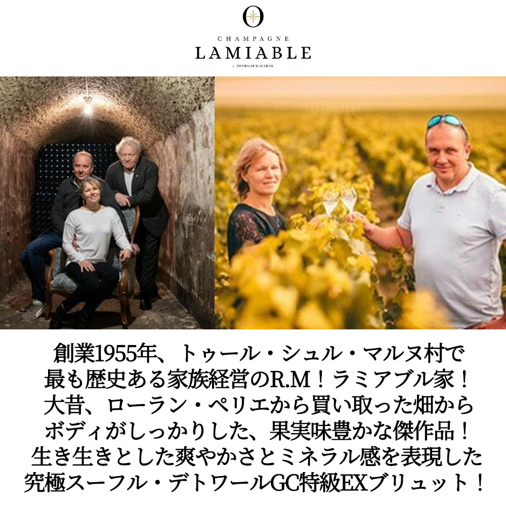 シャンパーニュ辛口愛好家大注目!特級シャンパーニュ愛好家大注目!あのローラン・ペリエも本拠地にするグラン・クリュ産地!トゥール・シュール・マルヌ特級ファン大注目!創業1955年、トゥール・シュル・マルヌ村で最も歴史のある家族経営のR.M!ラミアブル家!現在では約5.7haの畑を所有し、厳格なリュット・レゾネで栽培し、殺虫剤も除草剤も使用せず、有機肥料を使用し、現在はビオ認定申請中!最初にブドウを植えた土地がローラン・ペリエから買い取った (“Les Maslaines”) 畑だというのも一つの逸話!となっている。