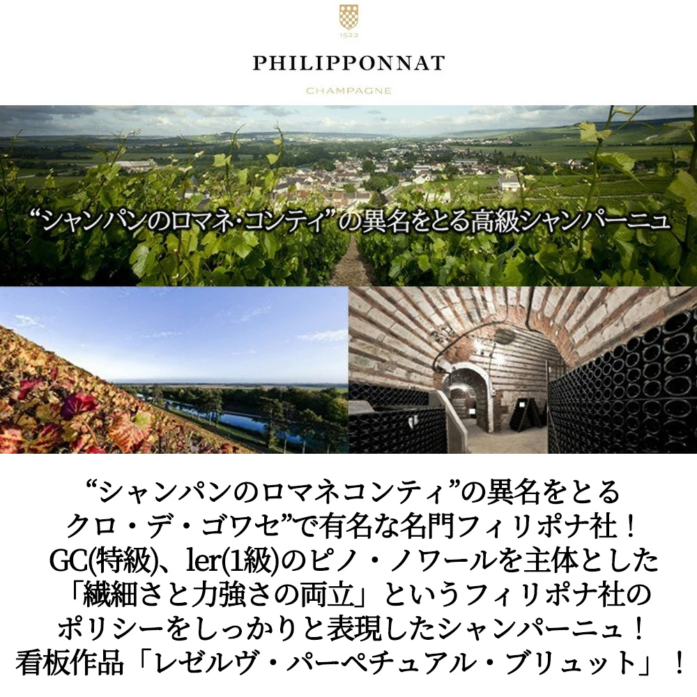フィリポナは16世紀よりシャンパーニュを造り続けている、歴史のある家族経営の老舗メゾン!アイ村においてシャンパーニュ造りをスタートし、1697年にフィリポナ社を創立!1935年には、シャンパーニュ地方でも数少ないモノポール「クロ・デ・ゴワセ」を所有し、その名を世界に知らしめました!現在は16代目当主、シャルル・フィリポナ氏を中心として、伝統的な製法を一貫して守り続けながらもその品質を絶え間なく向上させ、 世界でもトップレベルの素晴らしいシャンパーニュ造りを行うフィリポナ社の看板作品!「ロワイヤル・レゼルヴ」の名称を115年ぶりに改め、新たに「レゼルヴ・パーペチュアル」として生まれ変わりました!「「パーペチュアル」は、「永続的な」「絶え間ない」という意味を持ち、時間的に終わりがなく、常に続くことを示します。この新名称には、2つの意味が込められています。ひとつは、メゾンが長年実践してきた継ぎ足し熟成「パーペチュアル・リザーヴ」という技法を反映しています。これは、毎年新しいワインを継ぎ足すことで、熟成による奥行きとともにフレッシュさを保ち、複雑で魅力的な味わいを生み出す製法です。そしてもうひとつは、「絶え間ない進化」というメゾンの哲学を象徴し、フィリポナのモットー「In perpetual motion, naturally.(自然に、常に動き続ける)」に通じています。自然の摂理やうつろいを前向きにとらえ、小さな変革を日々繰り返す。変化が永続的にワインに新たな命を吹き込む。終わりのない、完璧なシャンパーニュの追求を表現しています。フィリポナのノンヴィンテージ・キュヴェは、「レゼルヴ・パーペチュアル」と呼ばれる、特別なブレンド技術によって造られています。1946年以来、フィリポナでは毎年、その年の収穫から得られた新しいワインに、前の年に造られたワインをブレンドするという手法を採用してきました。このプロセスは、時を重ねながら受け継がれていく“永続的なブレンド”のサイクルを形成しています。シャンパーニュにおけるブレンドは、まさに芸術です。毎年異なる条件のもとで収穫されるブドウから、均一でありながら奥深い味わいのノンヴィンテージ・シャンパーニュを生み出すためには、厳格な品質基準と、各クリュ(畑)の特徴を知り尽くしたテイスティングの技術が不可欠です。「レゼルヴ・パーペチュアル」という新しい名称には、ブレンドという技術の核心にある“継続性”と“完成度の追求”という、フィリポナの哲学が込められています。」!