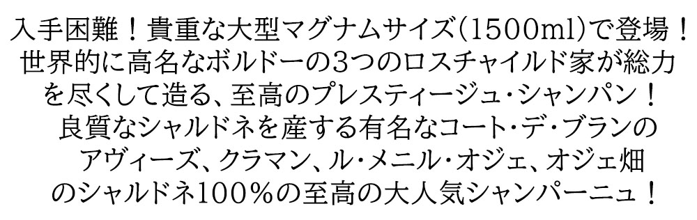 入手困難!高級シャンパーニュ愛好家大注目!高級ブラン・ド・ブラン・シャンパン愛好家大注目!貴重な大型マグナムサイズ(1500ml)!世界的に高名なボルドーの3つのロスチャイルド家が総力を尽くして造る、至高のプレスティージュ・シャンパーニュ!バロン・ド・ロスチャイルド家250年の栄華を象徴する特別なシャンパーニュの10周年を記念して、ムートン・ロスチャイルド、ラフィット・ロスチャイルド、シャトー・クラークを所有するファミリー(シャトー・ムートン・ロスチャイルドを所有するバロン・フィリップ・ド・ロスチャイルドをはじめとする、三社のロスチャイルドファミリー)が、一家のこれまでの功績とロスチャイルド家の精神的価値を代表するシンボルとして手掛けるシャンパーニュ、バロン・ド・ロスチャイルド!リリース直後から世界的なワイン評価誌でも高評価を獲得し、人気漫画「神の雫」にも登場するほど高い注目を浴びています!このバロン・ド・ロスチャイルド・ブラン・ド・ブランは、良質なシャルドネを産するコート・デ・ブランの、アヴィーズ、クラマン、ル・メニル・シュール・オジェ、オジェの畑のブドウを使用しています!土壌は太陽熱の蓄積・発散の効率がよい石灰岩質!石灰岩質土壌は水はけがよい特性に加え、雨季には適度に湿度を保ち、夏期の干ばつを防ぐ効果があります!手摘みで収穫されたブドウは圧搾後、一次発酵!ブレンドには40%のリザーヴワインを贅沢に使用し、最低でも4年間瓶内で熟成を行います!ドザ?ジュ(補糖)は約6gと低めに行い、澱引き後さらに6~9ヵ月熟成!ジェームス・サックリング91点!ヴィノス誌92点!ワインエンスージアスト誌92点!ワインスペクテーター誌90点!澄んだ緑金色!シャルドネ特有の、エキゾティックな白系果実のアロマが香ります!口に含むと非常に長く続く泡が印象的です!初めはクリーンで緻密な印象、後半にはシルキーなフルーツのフィネスが表れ、フレッシュさとエレガンスのバランスが絶妙です!エレガントでスマートなスタイルで、ぜひお食事と一緒にお愉しみいただきたいシャンパーニュです!どんな季節のお料理にも合いますが、ロブスターや蟹のグリルなど、特にシーフードとの相性は抜群!また、レモンのタルトなどデザートととも楽しめる究極高級ブラン・ド・ブラン・シャンパーニュ!至高のシャンパーニュが大型マグナムサイズで正規品で極少量入荷!