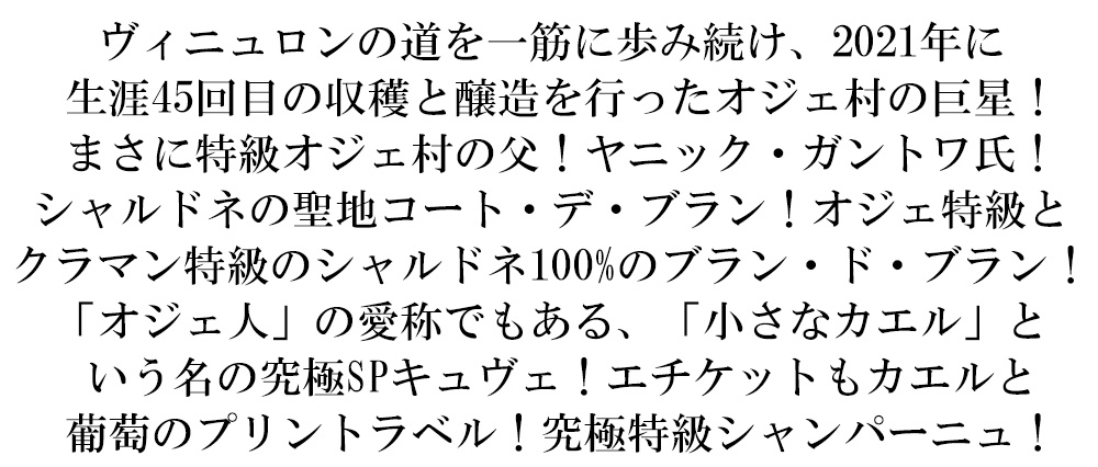 【商品名】ガントワ ルーヴェ シャンパーニュ キュヴェ デ ボトレ グラン クリュ 特級 ブラン ド ブラン ブリュット AOCシャンパーニュ 【英名】Gantois-Louvet Cuvee des Botterets Grand Cru Brut Blanc de Blancs Brut((Oger GC 50% & Cramant GC 50%) R.M AOC Champagne【商品説明】入手困難!大人気R.Mシャンパーニュ特級辛口愛好家大注目!シャルドネの聖地コート・デ・ブラン!しかもシャンパーニュ愛好家がシャンパンに求めるミネラル感そのものが存在する、ずばりシャルドネ100%のグラン・クリュであり、その中でもしなやかであり繊細で鋭く美しいフレーヴァーで定評のグラン・クリュ・クラマンと酸とミネラルで他のグラン・クリュを圧倒させるグラン・クリュ・オジェのシャルドネを各50%で造られる大人気シャンパーニュ!造り手の6代目当主ヤニック・ガントワが言います『コート・デ・ブランの主要4村それぞれのシャルドネの特徴を一口でまとめると、クラマンは柑橘系の果実味と鮮度感、アヴィズは口当たりのまろやかさ、オジェは酸とミネラル、ル・メニル・シュル・オジェは凝縮感と力強さです。ミネラルは4村すべての特徴ですがテロワール的にもオジェが筆頭です。このうちクラマンとオジェを同比率でブレンドすることにより、ふっくらとして爽快な果実味と、たっぷりとした酸、ミネラルの深い塩味を、1本ですべて楽しむことができます。そしてこのブレンドによる醍醐味は、3年間以上ビン熟成させることによって短・中・長期的に最大となります。』造り手のガントワ家は「コート・デ・ブラン」のオジェ村に19世紀から続くヴィニュロンの名家で、1976年より6代目当主ヤニック・ガントワが運営しています!長らく「ガントワ・ヴァレ」の名称でRMを運営していましたが、1997年に、同じくヴィニュロン家出身のカリーヌ・ルーヴェを奥様に迎え入れたことで、「ガントワ・ルーヴェ」にバージョンアップしました!ヴィニュロンの道を一筋に歩み続け、2022年に生涯46回目の収穫と醸造を行った、オジェ村の巨星!「私たちオジェ村の若手ヴィニュロンたち全員から、父のように慕われています。栽培と醸造の極意を会得した達人であり、いつも優しい笑顔で、私たちに多くのことを教えてくれます」(「アンリ・ド・ヴォージャンシー」当主パスカル・アンリ)!ボトルにエッチングされたカエルは「オジェ村のシンボル」で、この村を訪れると、軒先のあちこちでカエルをモチーフにした飾りやオブジェを見つけることができます!作品名「キュヴェ・デ・ボトレ(ボトレのキュヴェ)」の「ボトレ」は、「小さなカエル」というもともとの意味に加えて、「オジェ人」の愛称でもあります!そのほとんどがフランス国内80%(レストラン、個人のシャンパン愛好家)に直行!輸出は20%(EU各国)のみ!ワイン誌は「Guide Hachette」等に掲載!このガントワ・ルーヴェ・シャンパーニュ・キュヴェ・デ・ボトレ・グラン・クリュ・特級・ブラン・ド・ブランは、すべてグラン・クリュのシャルドネ100%(オジェ産50%、クラマン産50%)!平均樹齢60年のV.V!ステンレスタンクで醸造!3年間以上ビン熟成!ドザージュはわずか8g/L!作品名の「キュヴェ・デ・ボトレ」は「オジェ人のキュヴェ」!エチケットはカエルと葡萄のプリントラベルになっています!もちろん現地のセラー数カ月前の蔵出し品で限定極少量入荷! 【ワインのタイプ】白 辛口 【ワインのテイスト】高級泡 スパークリング 【生産者】Yannick Gantois 【生産地】フランス/シャンパーニュ/AOCシャンパーニュ(グラン クリュ ブラン ド ブラン) 【生産年】 【内容量】750ml 【ブドウの品種/セパージュ アッサンブラージュ】シャルドネ100%,グラン・クリュ・クラマン50%,グラン・クリュ・オジェ50% 【注意文】 【商品番号】0103004014513