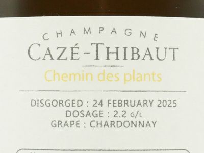 カゼ・ティボー・シャンパーニュ・“シュマン・デ・プラン”・エクストラ・ブリュット・(ドサージュ・わずか2.2g/L)・ブランドブラン・ミレジメ[2020]年・RM・生産者元詰(ファビアン・カゼ家=Fabien Caze)・有機栽培でドメーヌ所有の単一区画からのシャルドネ種100%&オーク樽で発酵、60ケ月以上熟成・AOCシャンパーニュ・デゴルジュマン2025年2月24日 (2018年初VTながら新進気鋭の造り手として世界中からの注目を一身に浴びている生産者) ・全世界に限定1964本のみ(表ラベルに表記)