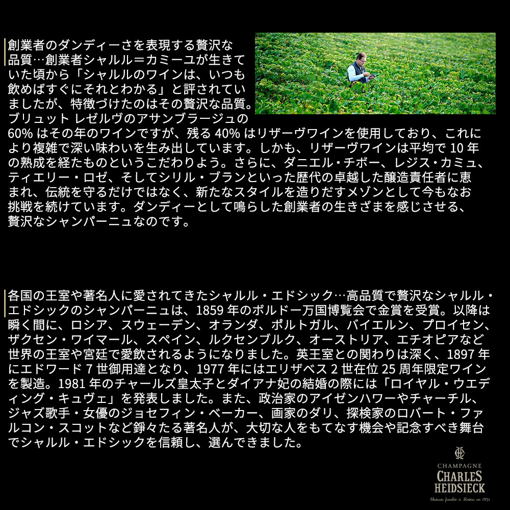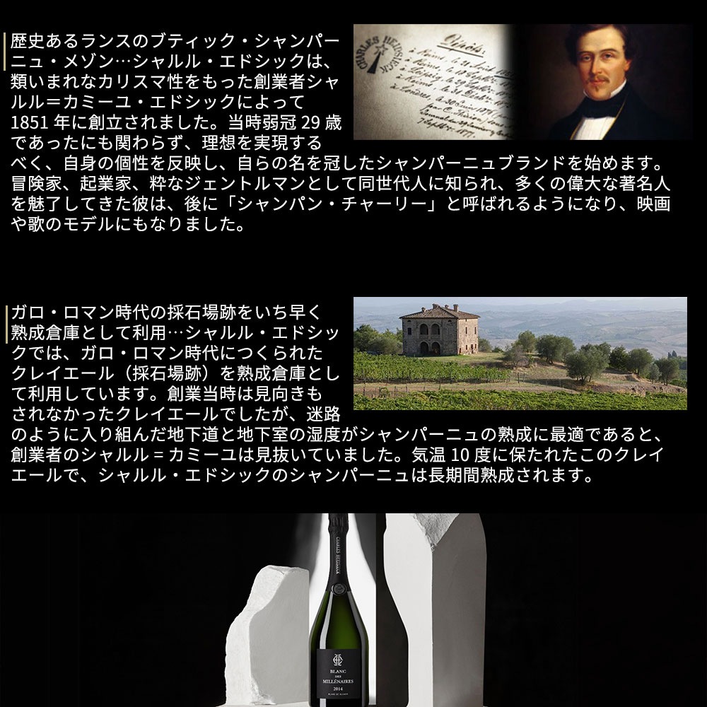 1851年にシャルル・エドシックとエルネス・アンリオによって設立の名門シャンパーニュ・メゾン!シャンパンで4番目の歴史を誇る究極メゾン!初代当主であったシャルル・カミーユ・エドシックの成功は、ミュージカルや映画にも登場!しかもイギリスとアメリカにその生産量のほとんどが直行してしまうため、日本ではN.Vのボトルでさえあまり見かけず、特にブラン・デ・ミレネールは1983年に初リリースされたあと、1985年、1990年、1995年、2004年、2006年、2007年、そしてこの2014年とわずか8ヴィンテージのみしか生産されていないシャンパン愛好家にとっても超希少品!Richard Juhlinの「A scent of Champagne」大注目!ベタンヌ&ドゥソーヴでも高評価で「品ぞろえは全体として素晴しく均質で極めてよく溶け込み、ヘーゼルナッツの実を感じさせ、すぐに見分けのつくスタイルに重きがおかれている。美味で魅惑的なシャルル・エドシックのすべてのシャンパーニュは、アペリティフにも食事にも最適」と絶賛!