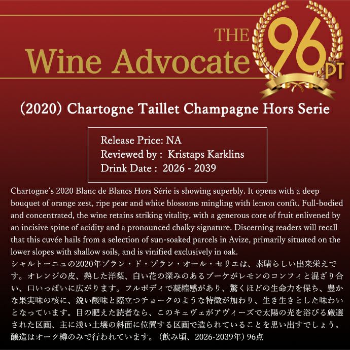 ワインアドヴォケイト誌驚異の96点の高評価獲得!絶賛コメントは『シャルトーニュの2020年ブラン・ド・ブラン・オール・セリエは、素晴らしい出来栄えです。オレンジの皮、熟した洋梨、白い花の深みのあるブーケがレモンのコンフィと混ざり合い、口いっぱいに広がります。フルボディで凝縮感があり、驚くほどの生命力を保ち、豊かな果実味の核に、鋭い酸味と際立つチョークのような特徴が加わり、生き生きとした味わいとなっています。目の肥えた読者なら、このキュヴェがアヴィーズで太陽の光を浴びる厳選された区画、主に浅い土壌の斜面に位置する区画で造られていることを思い出すでしょう。醸造はオーク樽のみで行われています。 (飲み頃、2026-2039年) 96点』と絶賛!!