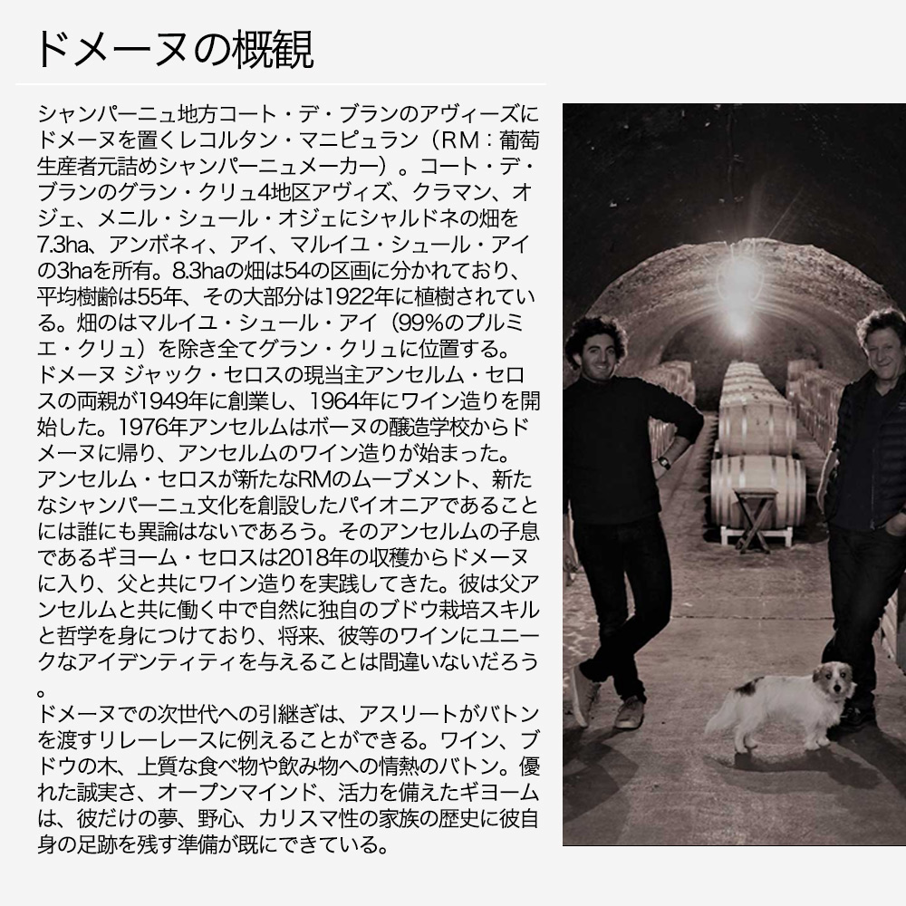 シャンパーニュ地方コート・デ・ブランのレコルタン・マニピュラン(RM:葡萄生産者元詰めシャンパーニュメーカー)。コート・デ・ブランの4地区アヴィーズ、クラマン、オジェ、メニル・シュール・オジェ、そしてアンボネイ。アイとマルイユ・シュール・アイの自社畑(全てグラン・クリュ)から、平均年産僅か4,000ケースの芸術的なシャンパーニュを造り出す。現当主アンセルム・セロス氏は「良いシャンパーニュは良いワインからしか生まれない、また良いワインは土地と気候と優れた栽培家に恵まれた葡萄でしか造れない。」と語り、自らの手で葡萄畑の土造りから出荷までを実践する。クラスマン2006年版で★★で紹介されている。