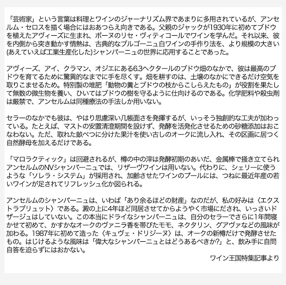自然派ビオディナミ・シャンパーニュの第一人者!アンセルム・セロスの手による究極シャンパーニュ!ドメーヌ・ジャック・セロス!