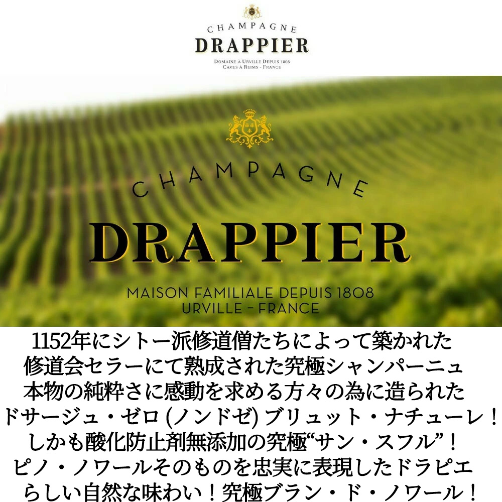 ウルヴィル村の南斜面の中腹、日照量の多い畑の成熟した厳選葡萄のみを使用!ブリュット・ナチュールを造る為の畑!収穫を通常よりも遅くすることで力強さ、果実のピュアさを得ている!ステンレスタンクで発酵、最低36ヶ月以上澱と共に熟成してからリリース!しかもドラピエでは「本物の純粋さに感動を求める方々のために、有機栽培(農薬未使用)のピノ・ノワール100%(ブラン・ド・ノワール)で、しかも第一搾り果汁のみを100%使用!しかも「門出のリキュール」(ドサージュ)一切なし!ドサージュ・ゼロのため残糖は自然の果実由来のもののみ!しかもシャンパーニュでは初めてとも言うべき酸化防止剤無添加!しかも色抜きなし、補糖なし!濾過なし(ノンフィルター)!とにかく人工的な技術を一切行わない、まさにピノ・ノワール種そのものを忠実に表現したドラピエらしい自然な味わい!あの完全有機農法(ビオディナミ)の先駆者として有名な故マルセル・ラピエール氏に「シャンパーニュはドラピエしか飲まないことにしている」と絶賛させた、まさにそのシャンパーニュ!