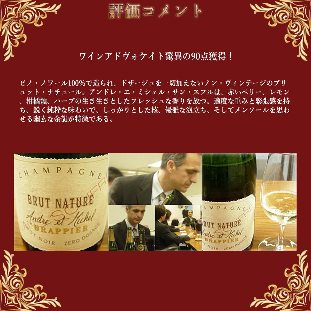 ドラピエ・シャンパーニュ・ナチュール・ゼロ・ドサージュ・“サン・スフル”・酸化防止剤無添加・本格辛口・ピノ・ノワール100%・自然派・AOC(ブラン・ド・ノワール)シャンパーニュ(サン・ザジュ・ド・スフル)・正規代理店輸入品・ワインアドヴォケイト驚異の90点&ワインスペクテーター92点