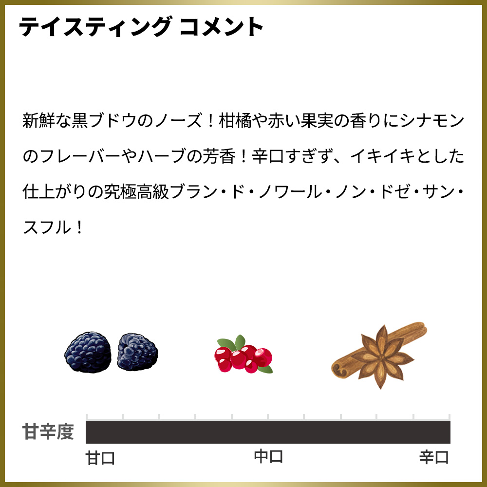 新鮮な黒ブドウのノーズ!柑橘や赤い果実の香りにシナモンのフレーバーやハーブの芳香!辛口すぎず、イキイキとした仕上がりの究極高級ブラン・ド・ノワール・ノン・ドゼ・サン・スフルが正規品で限定で登場!