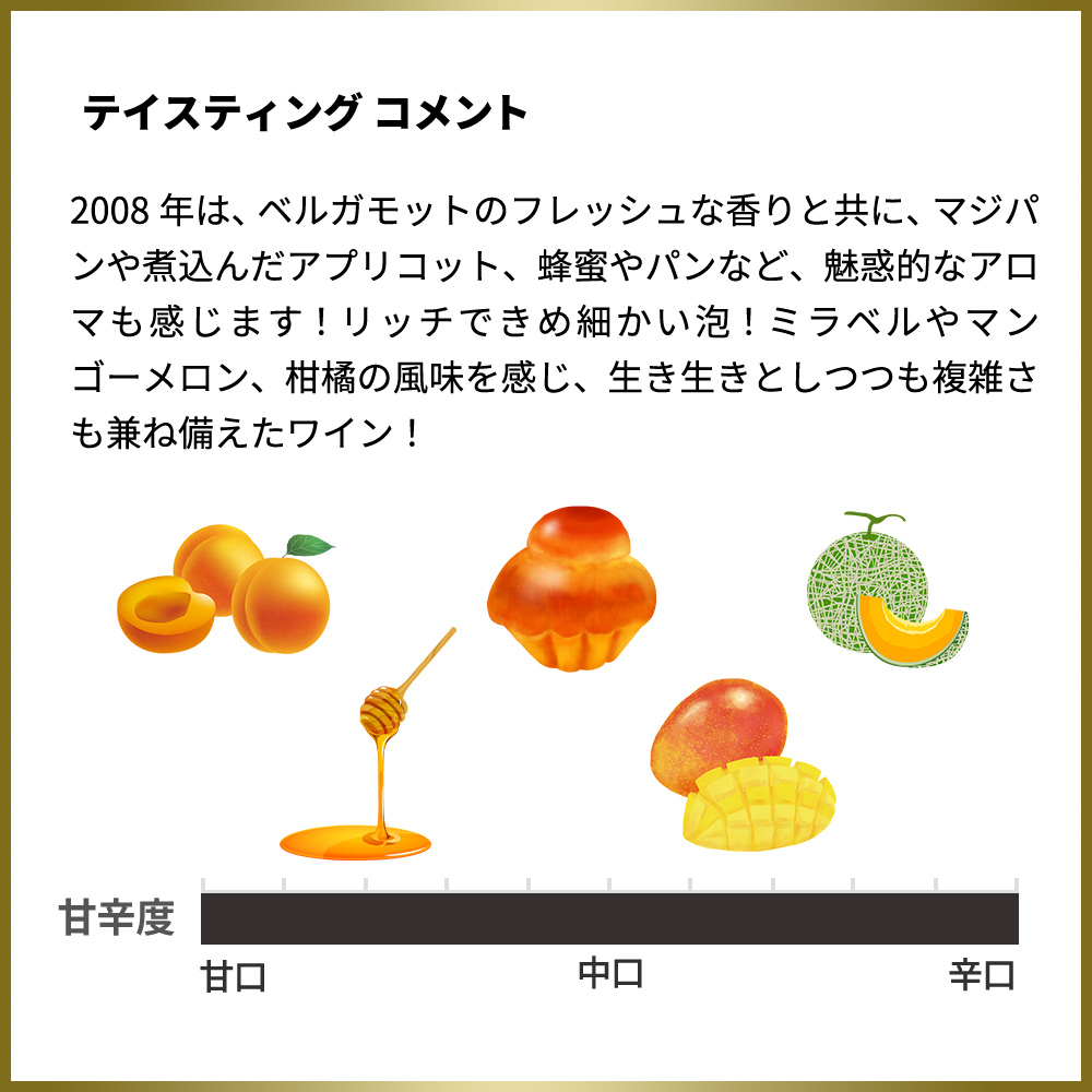 希少!高級シャンパーニュ愛好家垂涎!入手困難!各ワイン誌大絶賛!愛好家憧れの逸品!「時」がもたらす、ふたつの魅力!そのコントラストが奏でるラグジュアリーなハーモニー!2008年のキーワードは「熟成させたワインの絶妙なブーケと格別なフレッシュ感とのコントラスト」!