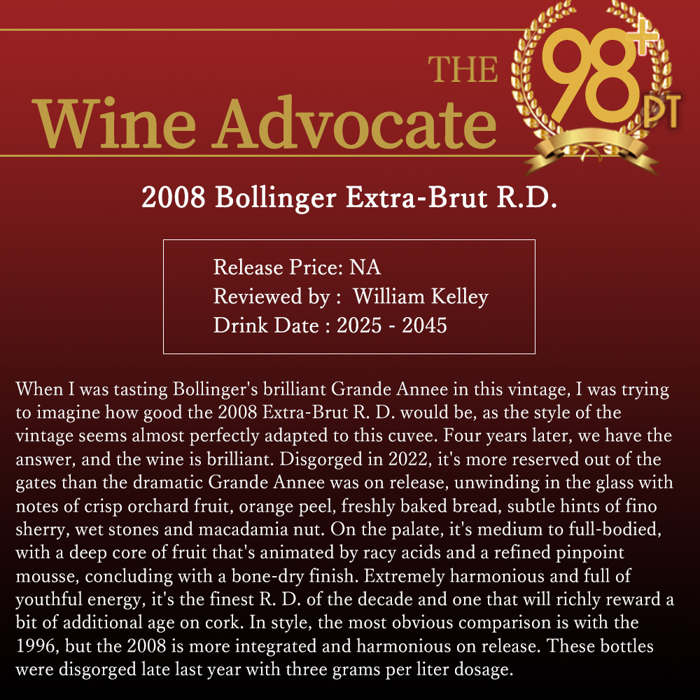 ボランジェ・シャンパーニュ『R.D.』ミレジム[2008]年・エクストラ・ブリュット・AOCミレジム・シャンパーニュ(蔵出し品)デゴルジュ2022年10月・ワインアドヴォケイト誌驚異の98+点(今-2045年)&ジェームス・サックリング99点&ヴィノス誌96点・正規代理店輸入品