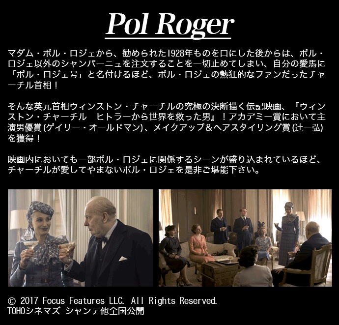 【チャーチル首相がこよなく愛した ポル・ロジェ社の ヴィンテージシャンパン】 1908年に初めてポル・ロジェ社のシャンパンを飲んで以来、チャーチル首相は生涯毎日ポル・ロジェのシャンパンを飲んでいたという逸話はとても有名。特に絶賛したのが1928年もののヴィンテージシャンパンでした。その出会いは1944年11月のノルマンディ上陸作戦の成功を祝う会でのこと。シャンパン愛飲家のチャーチル首相に、一番良い畑の一番良いブドウで、最高のヴィンテージの年「1928年」に造られたシャンパンを、ポル・ロジェ社一族のひとりオデット夫人(創業者孫の妻)がすすめたのが始まり。それを飲んだチャーチル首相は「私の味覚は単純で、最高のものにはすぐに満足してしまう」と賞賛し、以来その味わいの虜になったといわれています。