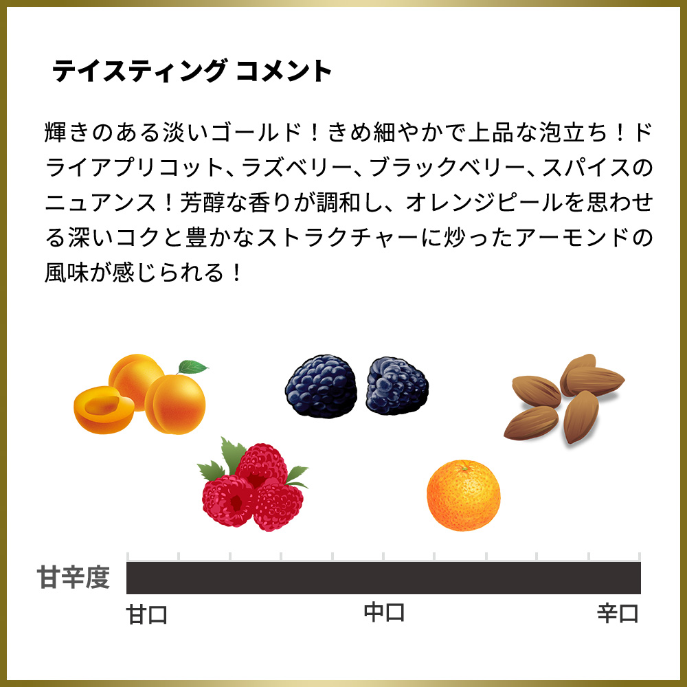 - ブドウ品種ピノ・ノワール50%、シャルドネ47%、ピノ・ムニエ3%