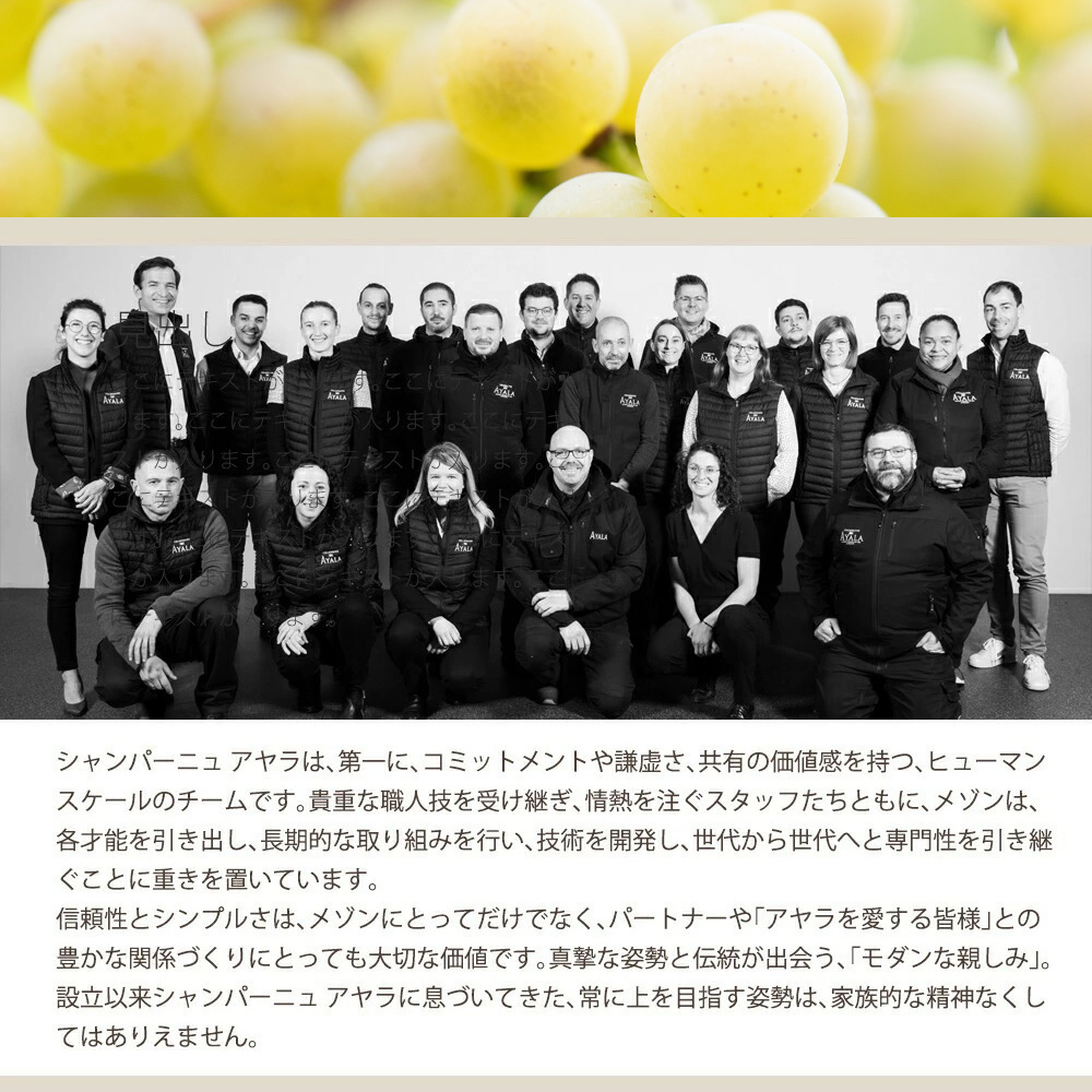 アヤラについて輸入元様は「グラン・クリュ畑の広がるアイで1860年に誕生した「シャンパーニュ・アヤラ」は、160年以上の歴史を持つシャンパーニュ地方でも最も古いメゾンの一つです。 ピュアでエレガントなスタイルで愛されているこのメゾンは2023年よりスタンダードキュヴェを一新し、熟成したシャルドネのポテンシャルをさらに引き出したスタイルへと生まれ変わりました。エドモンド・デ・アヤラにより1860年に創業したアヤラは、当時ドサージュ100g/lほどの甘口が主流の中、1865年にドサージュ21g/lのみの辛口シャンパーニュを先駆者としてリリース。また1882年に作られたグランド・マルク組合の設立メンバーとなり、1908年には英国ロイヤルワラントの称号を獲得。1920年代には年間100万本もの生産を誇る黄金時代を迎えました。2005年にはボランジェファミリーの一員に。醸造所はステンレスタンクに特化した最新鋭の設備に刷新され、シャープでスタイリッシュなブランドアイデンティティを確立。2017年には再び生産量100万本に到達しました。