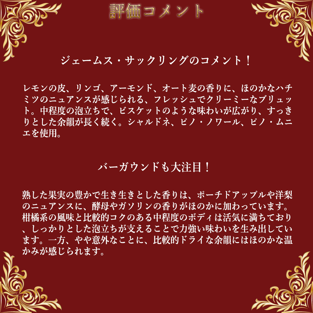 ジェームス・サックリングも「レモンの皮、リンゴ、アーモンド、オート麦の香りに、ほのかなハチミツのニュアンスが感じられる、フレッシュでクリーミーなブリュット。中程度の泡立ちで、ビスケットのような味わいが広がり、すっきりとした余韻が長く続く。シャルドネ、ピノ・ノワール、ピノ・ムニエを使用。」!
