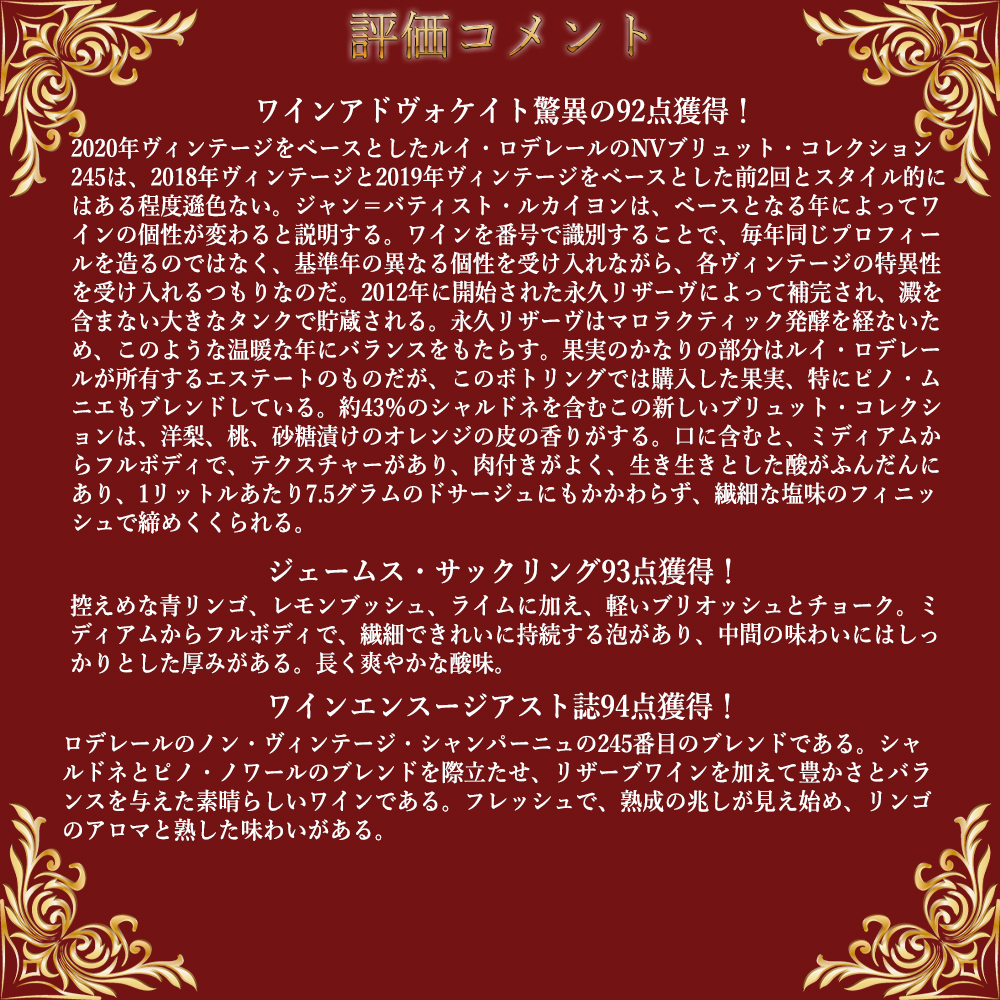 ワインエンスージアスト誌94点で「ロデレールのノン・ヴィンテージ・シャンパーニュの245番目のブレンドである。シャルドネとピノ・ノワールのブレンドを際立たせ、リザーブワインを加えて豊かさとバランスを与えた素晴らしいワインである。フレッシュで、熟成の兆しが見え始め、リンゴのアロマと熟した味わいがある。」と大注目!