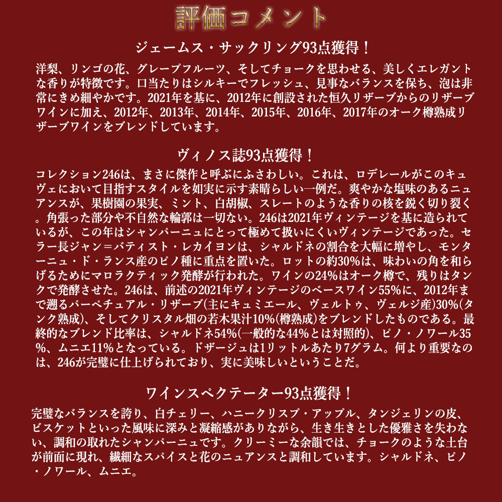 ヴィノス誌93点でコメントは「コレクション246は、まさに傑作と呼ぶにふさわしい。これは、ロデレールがこのキュヴェにおいて目指すスタイルを如実に示す素晴らしい一例だ。爽やかな塩味のあるニュアンスが、果樹園の果実、ミント、白胡椒、スレートのような香りの核を鋭く切り裂く。角張った部分や不自然な輪郭は一切ない。246は2021年ヴィンテージを基に造られているが、この年はシャンパーニュにとって極めて扱いにくいヴィンテージであった。セラー長ジャン=バティスト・レカイヨンは、シャルドネの割合を大幅に増やし、モンターニュ・ド・ランス産のピノ種に重点を置いた。ロットの約30%は、味わいの角を和らげるためにマロラクティック発酵が行われた。ワインの24%はオーク樽で、残りはタンクで発酵させた。246は、前述の2021年ヴィンテージのベースワイン55%に、2012年まで遡るパーペチュアル・リザーブ(主にキュミエール、ヴェルトゥ、ヴェルジ産)30%(タンク熟成)、そしてクリスタル畑の若木果汁10%(樽熟成)をブレンドしたものである。最終的なブレンド比率は、シャルドネ54%(一般的な44%とは対照的)、ピノ・ノワール35%、ムニエ11%となっている。ドザージュは1リットルあたり7グラム。何より重要なのは、246が完璧に仕上げられており、実に美味しいということだ。」!