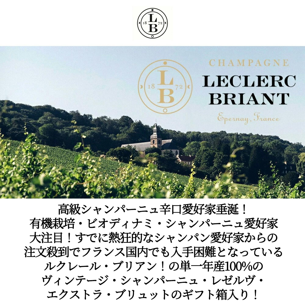 【箱入】ルクレール・ブリアン・シャンパーニュ・レゼルブ・エクストラ・ブリュット・ミレジメ(2021)・ルクレール・ブリアン(エルヴェ・ジュスタン経営)・自然派・有機栽培・ビオディナミ(AB認定)&Bio EU認定&ヴィーガン認定・ロットナンバー入り・AOCシャンパーニュ・ティラージュ2022年7月&デゴルジュマン2025年9月・ドサージュ4.5g/l・箱入り