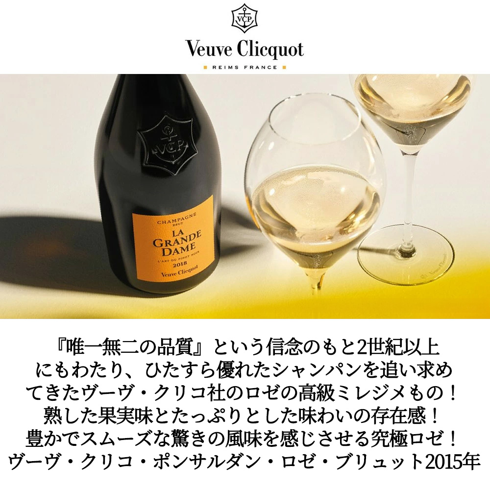 あのルイ・ヴィトン・グループの旗艦シャンパーニュ!!『唯一無二の品質』という信念のもと2世紀以上にもわたり、ひたすら優れたシャンパンを追い求めてきたヴーヴ・クリコ社の味とスタイルを代表する大人気シャンパーニュ!しっかりとしたボディに繊細さ、エレガントさが加えられたヴィンテージ・シャンパーニュ!ヒュー・ジョンソン氏をして「この上ない名声に包まれた歴史のあるシャンパン会社。ほとんどが芳醇なまでにコクのある最も確かなシャンパンのひとつ」と絶賛する、ヴーヴ・クリコによる人気のロゼ・ブリュット・ヴィンテージ[2015]年もの!