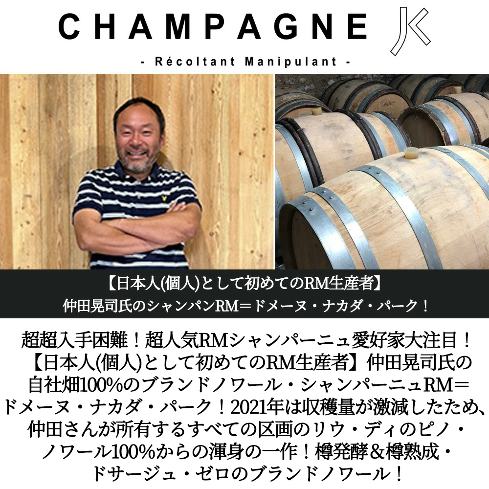【日本人(個人)として初めてのRM生産者】仲田晃司氏のシャンパンRM=ドメーヌ・ナカダ・パーク!『「シャンパンが大大大好きで、機会があればぜひ自分の手でシャンパンを造ってみたいとずっと思っていました」という仲田さんに、2019年、合計1.2ヘクタールの4区画を取得する機会が訪れ、ほとばしる情熱と煮えたぎる醸造家魂をもって翌2020年に設立されたRMです。(通常シャンパーニュはオーナーの意向が強く、購入が難しいのだが、仲田さんの人柄、信頼関係などから購入できた。)直後よりビオロジック栽培を開始し、2023年に「ビュロー・ヴェリタス」の認証を取得しています。「ブルゴーニュの精神と日本人の味覚を融合させたシャンパンを造ることを目指しています。ブルゴーニュと同じ単一区画、単一品種、単一収穫年、樽発酵、樽熟成、樹齢35年以上のVVのノンドゼを基本として、栽培においても、さらに風通しを良くするためにシャンパーニュではほとんど行われていないエフイヤージュ(除葉)やエブルジョナージュ(摘芽)といったブルゴーニュの手法を実践しています」。