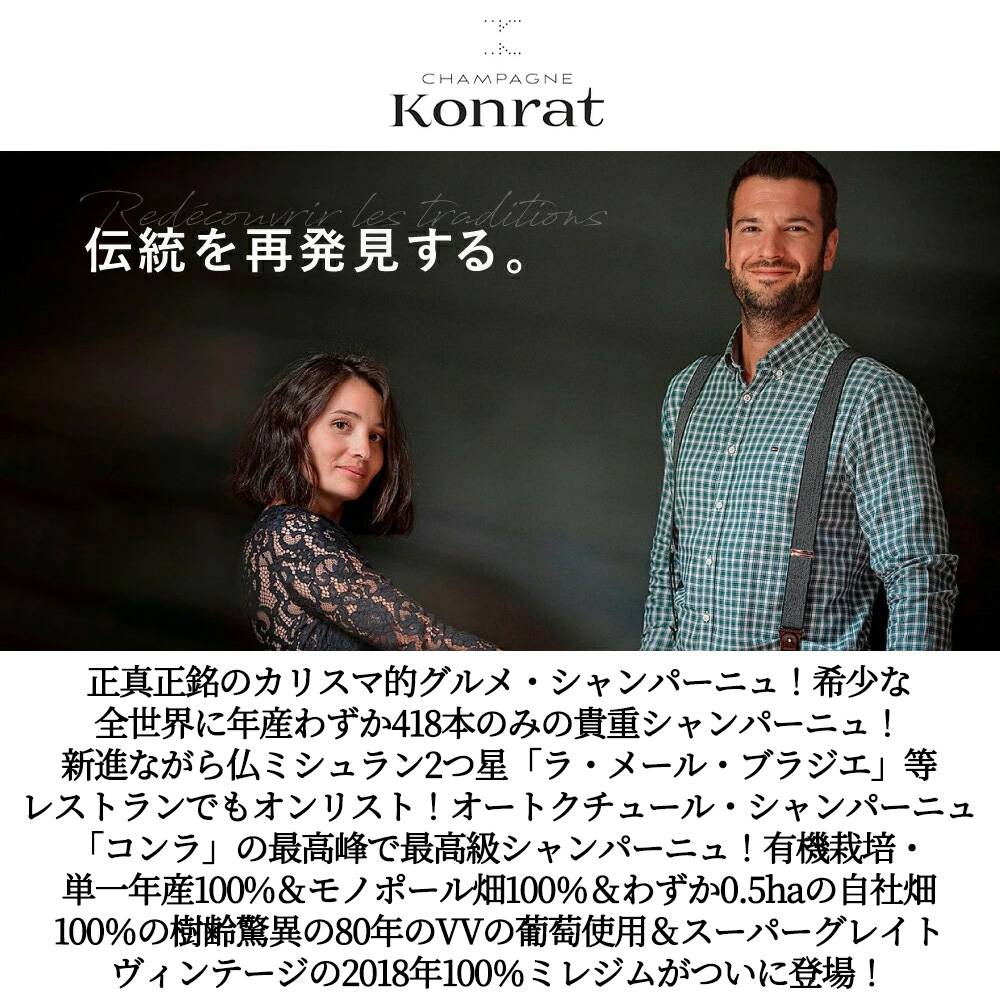 超超入手困難!最高級シャンパーニュ愛好家大注目!正真正銘のカリスマ的グルメ・シャンパーニュ愛好家大注目!希少な全世界に年産わずか418本のみの貴重シャンパーニュ!なんと!2018年登場 (継承) の新進ドメーヌ!から2020年にリリースされたオートクチュール・シャンパーニュ「コンラ」の最高峰で最高級シャンパーニュ!有機栽培・単一年産100%&モノポール畑100%&わずか0.5haの自社畑100%の樹齢驚異の80年のVV・ヴィエイユ・ヴィーニュの葡萄使用&エクストラ・ブリュット&スーパーグレイトヴィンテージの2018年ミレジムがついに登場!アシェットガイド誌2026年版でもこのスーパーグレイトヴィンテージの2018年が星付★で掲載!新進ながら「Gault & Millau」等のワインプレスでも大注目!仏ミシュラン2つ星「ラ・メール・ブラジエ」等レストランでもオンリスト!個人のシャンパン愛好家からも絶大な支持を受けるドメーヌ・コンラ) (4代目マルク・コンラ家) !からなんと!希少な全世界に年産わずか418本のみの貴重シャンパーニュ!しかもスーパーグレイトヴィンテージの2018年もの!