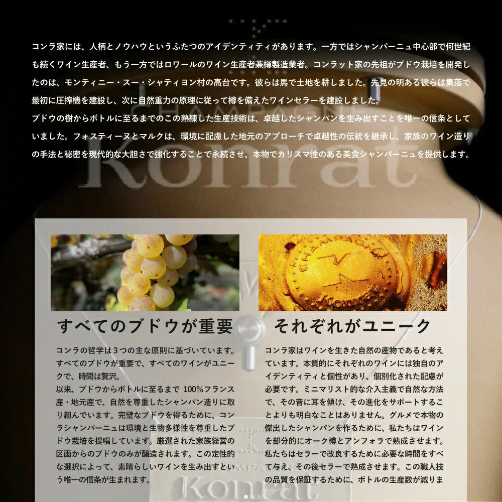 ※1960年代におじいさんが亡くなってからしばらくの間、一部の畑を従弟にフェルマージュしていた関係で、登記上は2023年10月31日まではNMでしたが、同11月1日よりRMになりました!こうして2020年にリリースされたオートクチュール・シャンパーニュ「コンラ」は、世界中のシャンパン・ラヴァーや関係者から大きな注目を集めることになりました!高品質を維持するため少量生産を貫いており、日本にも少量でのご案内となります! (ファウスティーヌ&マルク・コンラは、この卓越した伝統を受け継ぎながら、環境に配慮し、地元に根ざした方法で、一族のワイン造りの技術と秘密を永続させ、現代的な大胆さを加えて、正真正銘のカリスマ的グルメ・シャンパンを提供しています。)
