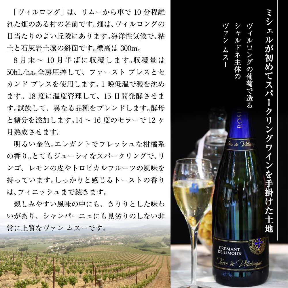 造り手はフランスのワイン評価誌「アシェット・ガイド」で毎年のように掲載され、リムーの名手として知られる有力生産者ドメーヌ・ロジェの手による当主ミシェルが初めてスパークリングワインを手掛けた土地ヴィルロングの葡萄100%で造るモーザック種90%、シャルドネ種10%の単一年産100%のブランケット・ド・リムー!のミレジメのスペシャル・キュヴェ!