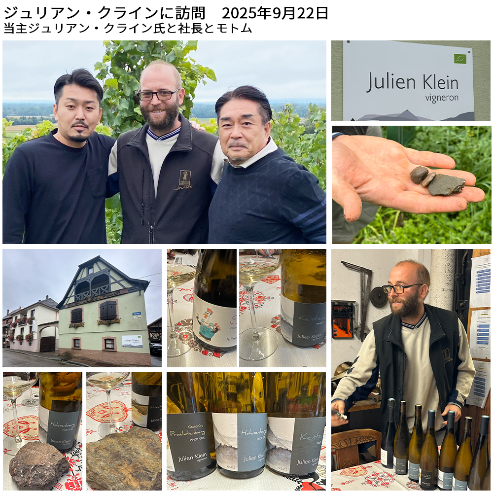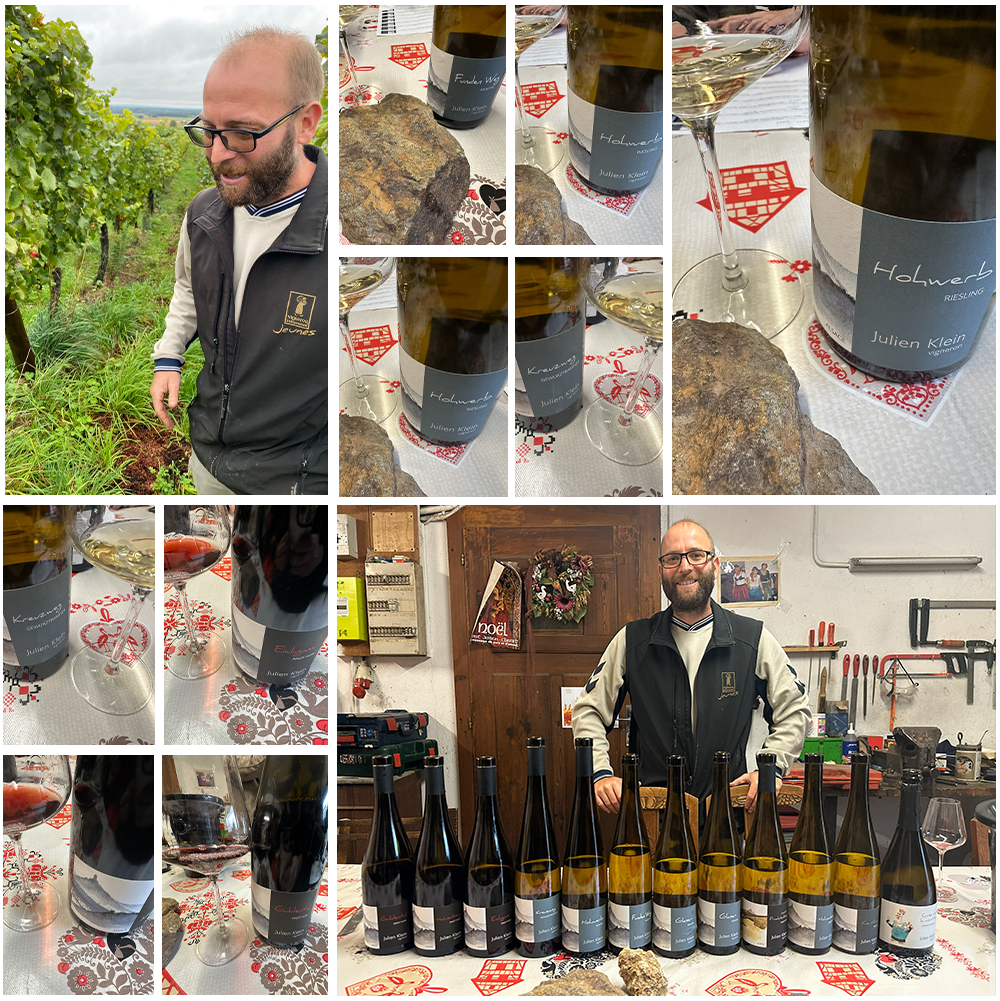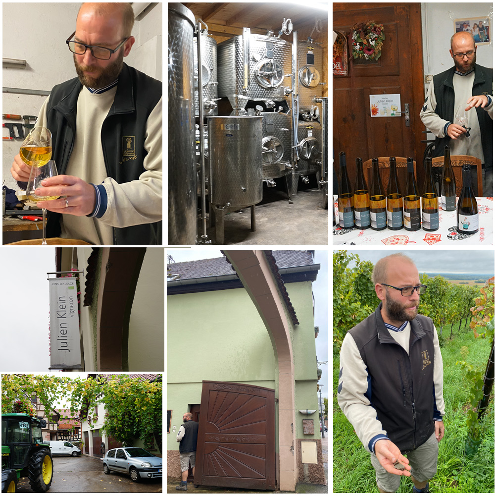 以下インポーターさんのコメントは『ジュリアン・クラインは、コルマール市から北へ20km、「バ・ラン」最南部に位置するキンツハイム村に1950年より続くぶどう栽培家の次男として生まれました。2006年にメゾン「フェルナン・アンジェル」に入社して畑仕事に従事する傍ら、0.07ヘクタールの畑を取得して自身のぶどう栽培を開始。2009年以降はビオロジック栽培を実践しながら、少しずつ畑を買い足していきました。2015年に同メゾンを退社して、ブルゴーニュ・マルサネ村のシルヴァン・パタイユに師事。自然派ワインのマエストロから栽培と醸造の極意を授かりました。そして2017年、アルザスに帰還して自身のドメーヌを設立し、若き日の夢を実現させました。創業時の所有畑は約1ヘクタールでしたが、ジュリアンの説得によって2011年よりビオロジック栽培に転換していた実家の畑の一部も譲ってもらえることになり、現在は2.3ヘクタールの業容となっています。「専業ドメーヌとしてはアルザスで一番小さいドメーヌかもしれませんね(笑)。でもだからこそ、畑のぶどう樹の1本1本まで、カーヴの隅々まで、私の意識が行き届きます。清潔保持はもちろん、高度な観察力と注意力が求められる自然派ワイン造りにおいて、小さいことは大きな利点となります。醸造はシルヴァン・パタイユから学んだことをベースとしてミニマルに行っています。除梗も、酵母添加も、添加物も、清澄もなにもなしです。SO2は瓶詰時に10g/lほど添加しているのみです」。「私自身が本当に飲みたいと思うワインを造りたいです。それは細密画のように精緻で複雑さを極めたワインであり、熟成への高いポテンシャルを持つワインです」。ひとりで運営しておりほとんどの時間は畑にいるので、販売にまったく手が回りません、と笑うジュリアン。しかし、たまたま彼の作品を飲んで驚愕した地元のミシュラン星付きレストランのソムリエさん発の口コミで一気にオンリストの波が広がるなど、営業活動をする必要もなさそうです。輸出は日本が第一号となります(!)。』