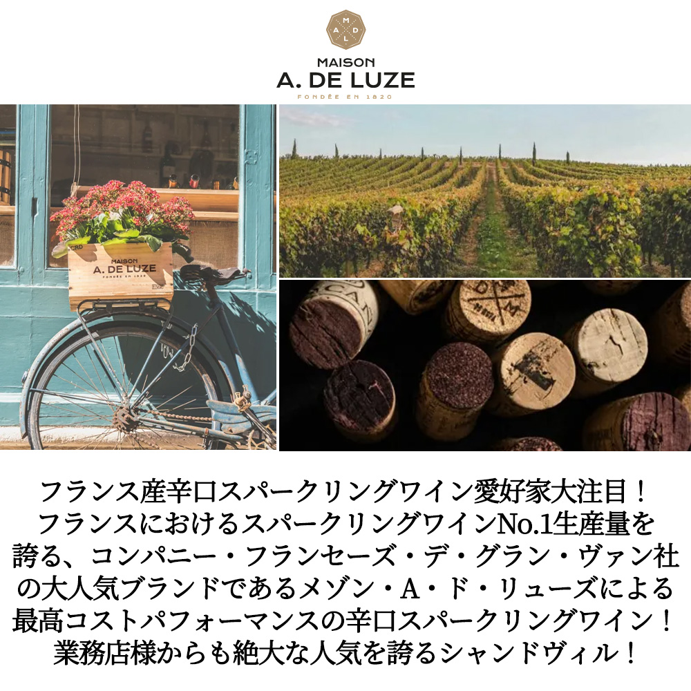 フランス産辛口スパークリングワイン愛好家大注目!フランスにおけるスパークリングワインNo.1生産量を誇る、コンパニー・フランセーズ・デ・グラン・ヴァン社の大人気ブランドであるメゾン・A・ド・リューズによる最高コストパフォーマンスの辛口スパークリングワイン!