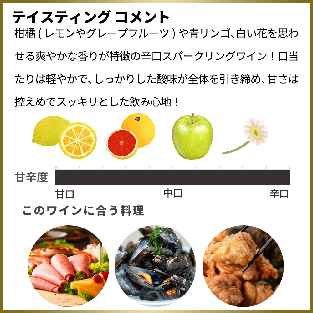柑橘(レモンやグレープフルーツ)や青リンゴ、白い花を思わせる爽やかな香りが特徴の辛口スパークリングワイン!口当たりは軽やかで、しっかりした酸味が全体を引き締め、甘さは控えめでスッキリとした飲み心地!泡はフレッシュで軽快、余韻は短めでさっぱりしています!複雑さやコクよりも飲みやすさを重視したスタイルで、前菜や魚介、揚げ物など幅広い料理と相性が良く、日常的に気軽に楽しめる一本!