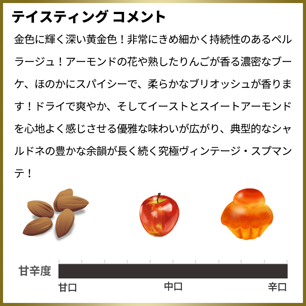金色に輝く深い黄金色!非常にきめ細かく持続性のあるペルラージュ!アーモンドの花や熟したりんごが香る濃密なブーケ、ほのかにスパイシーで、柔らかなブリオッシュが香ります!ドライで爽やか、そしてイーストとスイートアーモンドを心地よく感じさせる優雅な味わいが広がり、典型的なシャルドネの豊かな余韻が長く続く究極ヴィンテージ・スプマンテ!