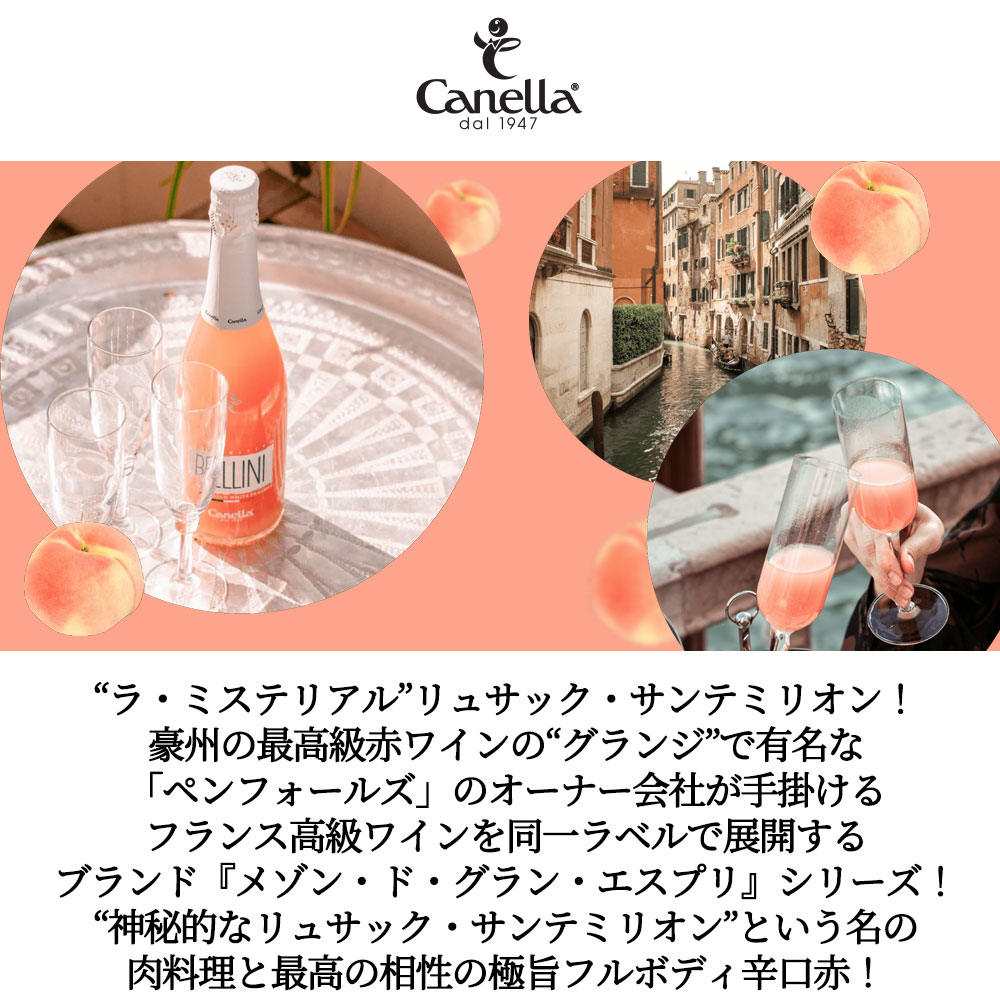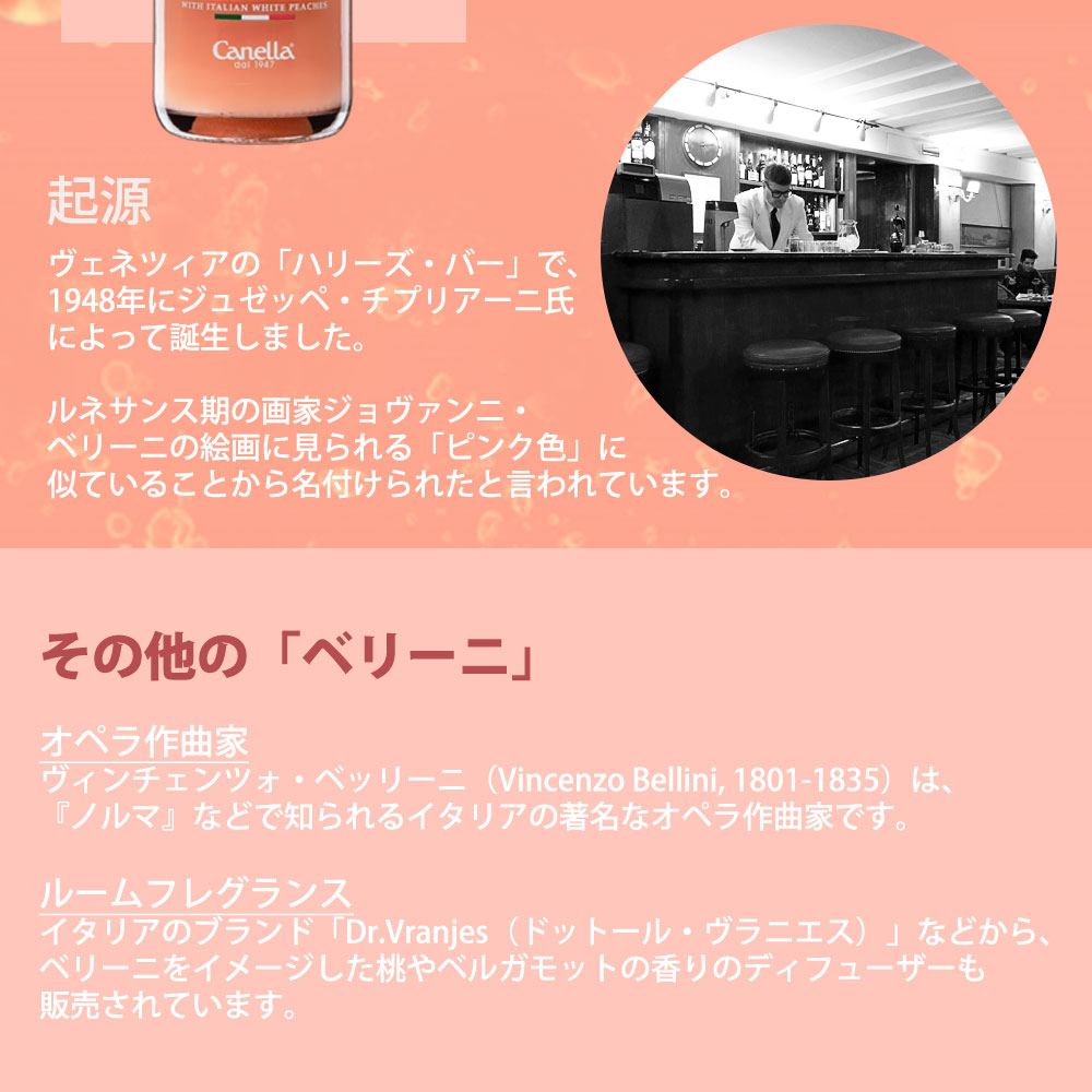 (あのヴェネツィアの「ハリーズ・バー」でも有名な完熟した白桃のピューレ(果肉)と、イタリア産のスパークリングワイン(プロセッコなど)を混ぜて作られ、桃の優しい甘さと華やかな泡が特徴の本格フルーツスパークリングカクテルがご家庭でもお楽しみ頂けます。)