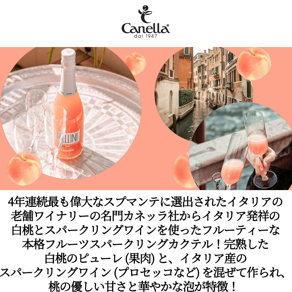 カネッラ・ベリーニ(フルーツスパークリング=発泡性)・イタリアの老舗ワイナリーの名門カネッラ社・甘味果実酒・750ml・イタリア産のピーチを使用した圧倒的果肉感!(もも果汁&果肉使用)・本格フルーツスパークリングカクテル・イタリア・ヴェネト州・アルコール度数5%