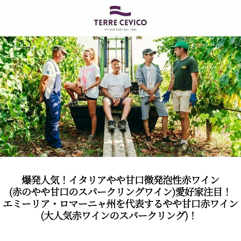 造り手は今やロマーニャ全域のワインを製造するイタリアを代表する会社となったCE.VICO社!2000年以上もの間、トスカーナとロマーニャの間の、絵画のように美しいアベニン丘陵に広がる葡萄栽培に最適な土地でワインを製造していた生産者たちが、1950年代前半に彼らの経験を集め、共同でワインを造り始めたことに起源を持つ、チェビコ社!現在では、エミリア・ロマーニャのみならずヴェネト、トスカーナやウンブリア地方にまで生産規模を広げています!今では栽培、醸造、実験研究、分析など多方面においてその活躍の場を広げており、近年では太陽光を利用した自家発電、環境負荷をゼロに近づける廃棄物の分別、排水の残渣管理など、サステナビリティへの取り組みへも積極的!60以上の国にワインを販売し、イタリア屈指の協同組合に成長!このランブルスコのような甘口寄りのロッソは、バーベキューや甘辛ダレの肉料理、日本の濃い味惣菜とも相性がよく、よく冷やして(8-10度前後)楽しめます)