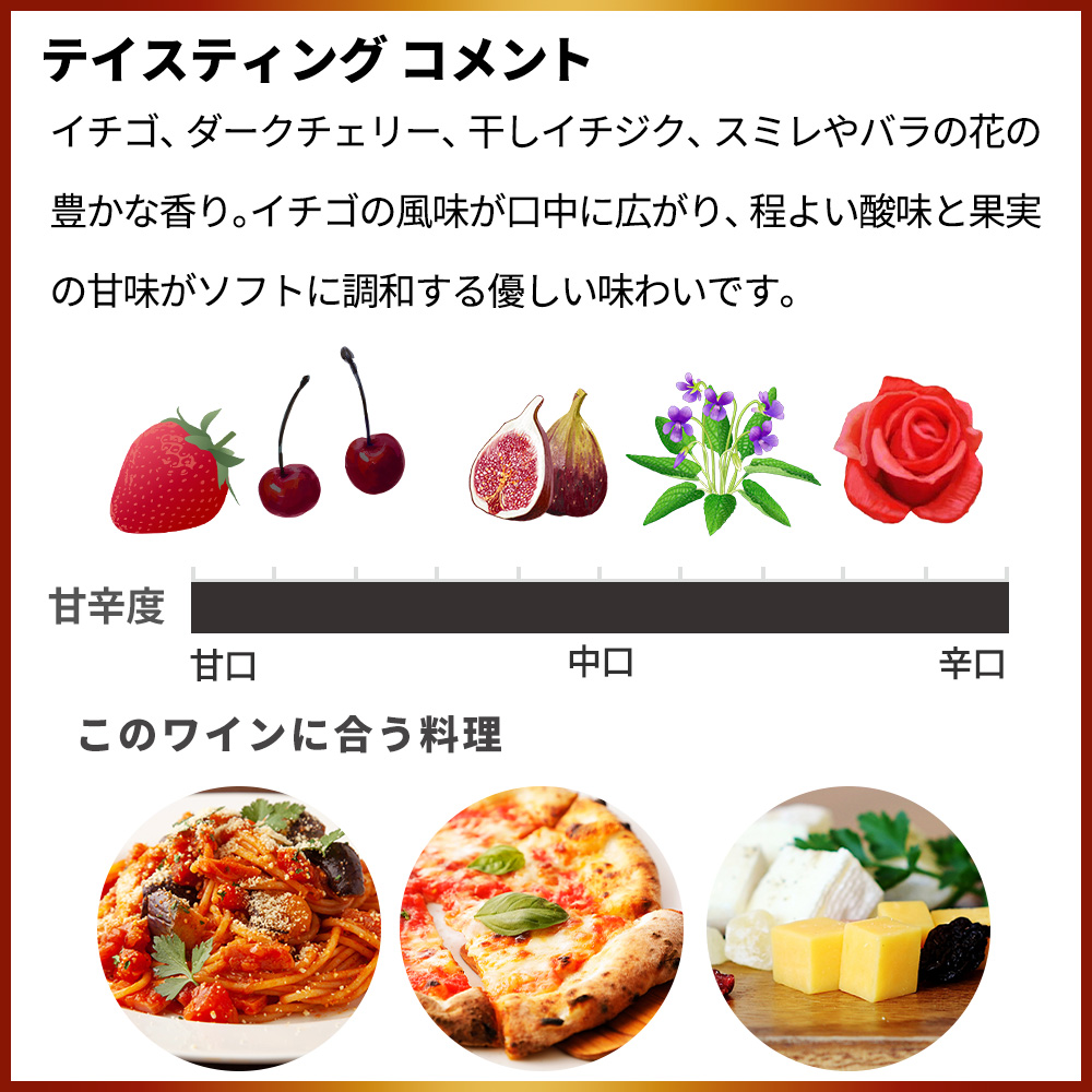フレッシュなイチゴやチェリーの香り、やさしい口当たりから豊かな果実味が広がるやや甘口の弱発泡性ワイン。微発泡性のあるルビー色。イチゴ、ダークチェリー、干しイチジク、スミレやバラの花の豊かな香り。イチゴの風味が口中に広がり、程よい酸味と果実の甘味がソフトに調和する優しい味わいです。