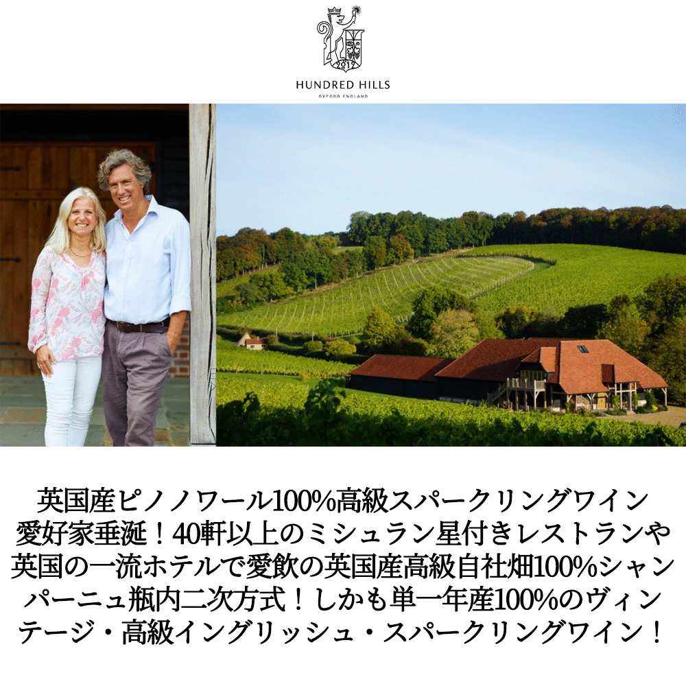 造り手の『ハンドレッド・ヒルズは、2012年にスティーブン・ダケットによって南イングランド・オックスフォードシャーに設立された、トップレベルのイングリッシュ・スパークリングワインのワイナリーです。スティーブンと妻フィオナは、1980年代後半にオックスフォード大学で出会い、長年にわたりヴィンテージ・シャンパーニュに情熱を注いできた愛好家でした。2000年、ある友人から贈られた銘柄不明のワインが驚くほど高品質であり、それがイングリッシュ・スパークリングだったことに衝撃を受けたことが、ワイナリー設立の原点となりました。3年かけて見つけたイングランド屈指のテロワール プロフェッショナルチームを編成し2009年から3年かけて理想の土地を探した結果、オックスフォードシャーに辿り着きました。