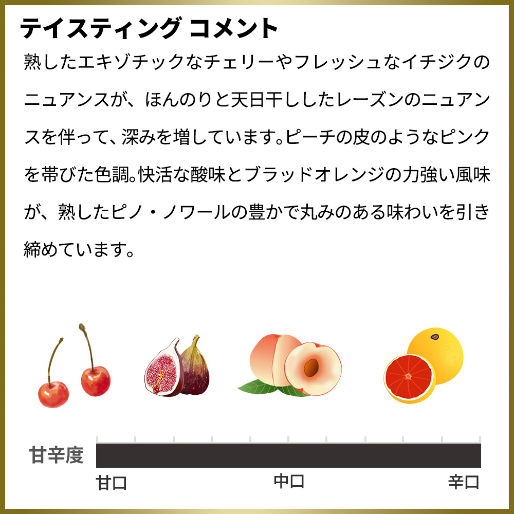 南東向きの丘陵地にある単一区画。深いゴールドに、ピーチの皮のようなピンクを帯びた色調。快活な酸味とブラッドオレンジの力強い風味が、熟したピノ・ノワールの豊かで丸みのある味わいを引き締めています。