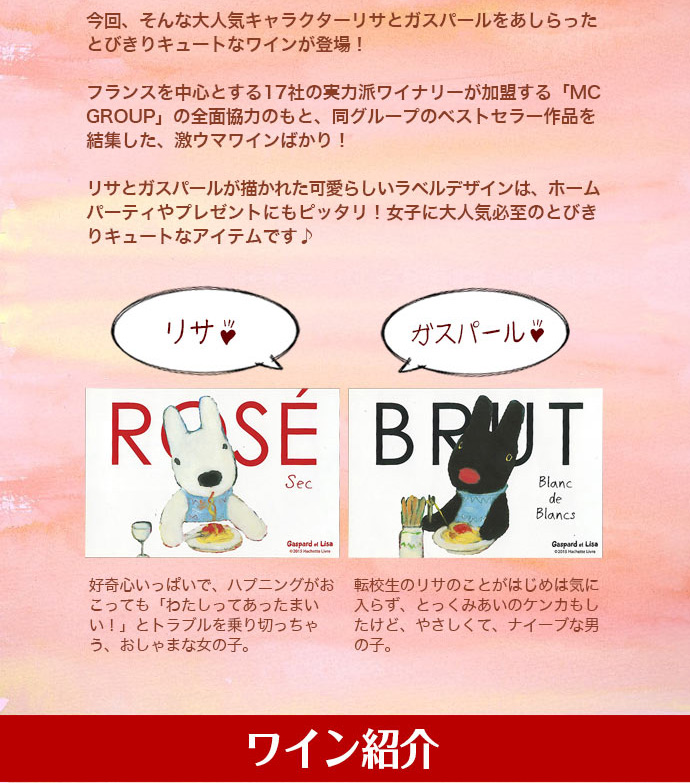 今、話題のリサとガスパールがワインのラベルになって新登場!このブラン・ド・ブラン・ブリュットは、1909年に設立という100年を超える歴史を持ち、スパークリングワインの生産本数がフランスでNo.1のワイナリー、CFGV社による、フレッシュさとまろやかさのバランスが素晴しく心地良く、余韻もお楽しみ頂ける白ブドウ100%(ユニ・ブラン種100%)で造られる究極辛口スパークリングワイン!!