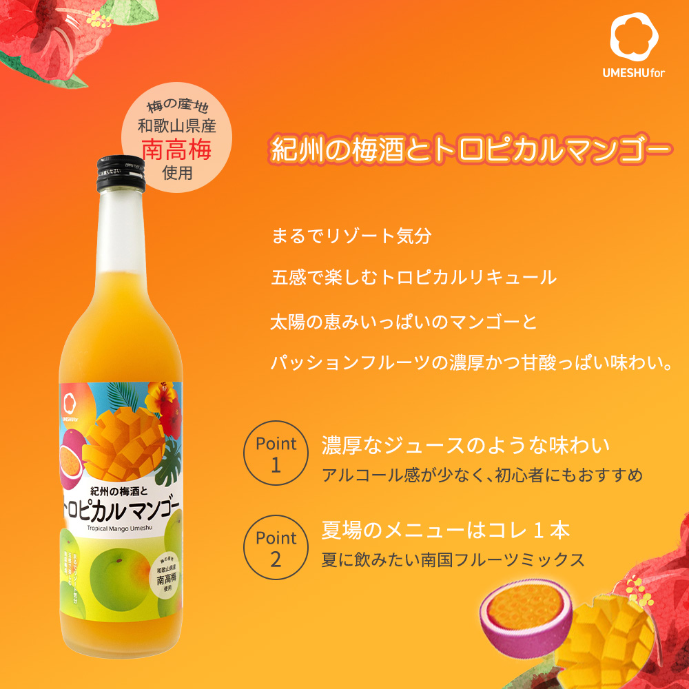 まるでリゾート気分!五感で楽しむトロピカルリキュール!太陽の恵みいっぱいのマンゴーとパッションフルーツの濃厚かつ甘酸っぱい味わい!紀州和歌山県産「南高梅」を使用した本格梅酒に、マンゴーピューレとパッションフルーツ果汁をブレンドしました!マンゴーの強い甘さが、パッションフルーツのキレのある酸味によって引き締められ、単調ではない、奥深い味わいになります!隠し味の梅酒がさらに風味豊かなトロピカル感と味わいの深みを演出します!真夏の海で飲みたい、リゾート感たっぷりのトロピカルリキュールです!