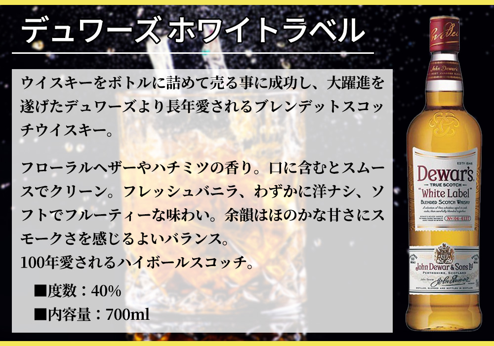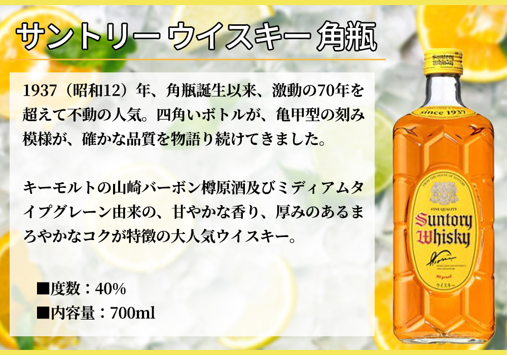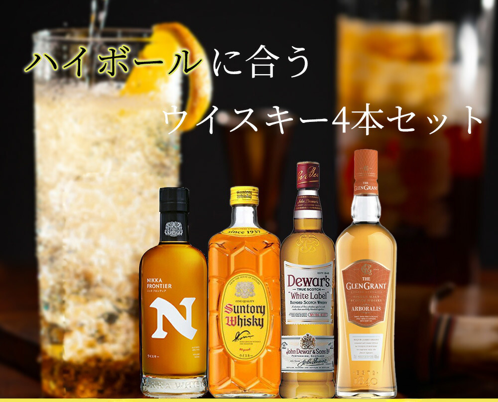 ハイボール愛好家必見!!ハイボールにして味わう最適なウイスキー!!日常的に食事と一緒に味わっていただけるハイボールの定番ウイスキーから週末に少し贅沢な味わいのハイボールをお楽しみいただけるウイスキーの4本セット!!ハイボールの中でも絶大な人気を誇る角瓶!!100年以上愛されるハイボールによく合うブレンデッドスコッチウイスキー!!デュワーズ!!新鮮で華やかなモルトフレーバーでイタリアにおいてはウイスキーといえばグレングラント!!と言われる程の人気!!グレングラントアルボラリス!!力強い風味の余市モルトをキーモルトに採用した、薫り高くスモーキーな味わい!!創業者・竹鶴政孝のフロンティアスピリットと、ニッカウヰスキーの革新的な挑戦を表現したフロンティア!!の4本セット!!
