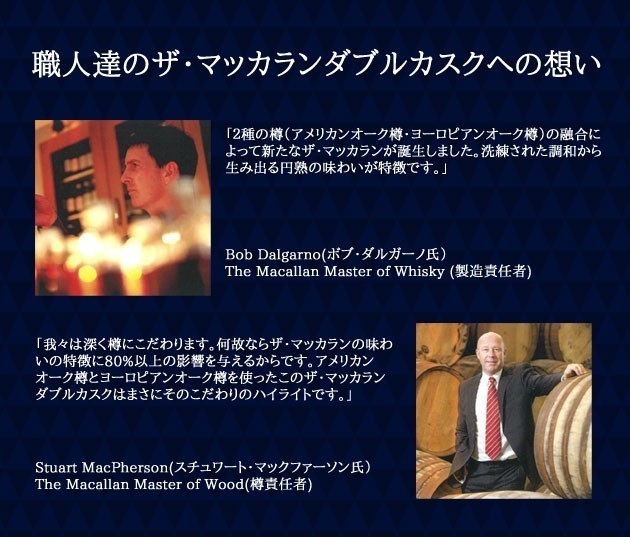 |  「Macallan」は肥沃な土地の意味を持つ「MAGH」と、8世紀にキリスト教伝播のためにスコットランドを広く旅したアイルランド人牧師聖フィランを意味する「ELLAN」の2つのゲール語に由来すると言われています。 ザ・マッカランの歴史に流れる共通の精神は、蒸溜所の創設者アレクサンダー レイド以来の質へのこだわりです。 1824年、地元の農業従事者であったレイドがライセンスを取得し、イースターエルキーで政府公認第二号蒸溜所として発足したことにより、ザ・マッカランが誕生しました。 | |  |  ザ・マッカランは、世界で最も多くの賞に輝き、絶賛されるシングルモルト。 この卓越した評判を支えるのが、過去2世紀においてザ・マッカランの中心的存在である「ウイスキーと樽材のマスター」すなわちウイスキー職人達の真摯な取り組みなのです。 | |  |  マスター達の完全さを追い求める徹底した姿勢が、一貫した品質の高さに表れており、このことが1824年正式に政府公認第二号蒸溜所のライセンスを取得して以来、ザ・マッカランの特徴となっています。 現在、ザ・マッカランウイスキーメーカーのボブ ダルガーノや、クライド クーバレージ(樽製造)、代表取締役のジョージ エスピーなどが、過去のマスター達の功績と専門技術を受け継いでいます。 彼らの指導により、ザ・マッカランは、Best Malt in the World*に選ばれ続けており、他のシングルモルトを鑑定する場合の比較対照となるモルトで、最高の銘柄としての地位を維持し続けています。 | | |  | ザ・マッカラン ダブルカスク 12年 最低12年以上熟成したヨーロピアンシェリー樽とアメリカンシェリー樽をヴァッティング。マッカランの特徴である芳醇さはそのままに、滑らかで甘みのある洗練されたバランスの良い味わい。深い金色。クリーミーなバタースコッチのような甘いアロマにアップルキャンディー、バニラカスタードといった甘いアロマがバランスよく感じられる。口に含むと蜂蜜のような甘さにややスパイシーでシトラスのフルーツ感が感じられる味わい。余韻は長く甘い味わいが続く樽へのこだわりが感じられる。 | | |