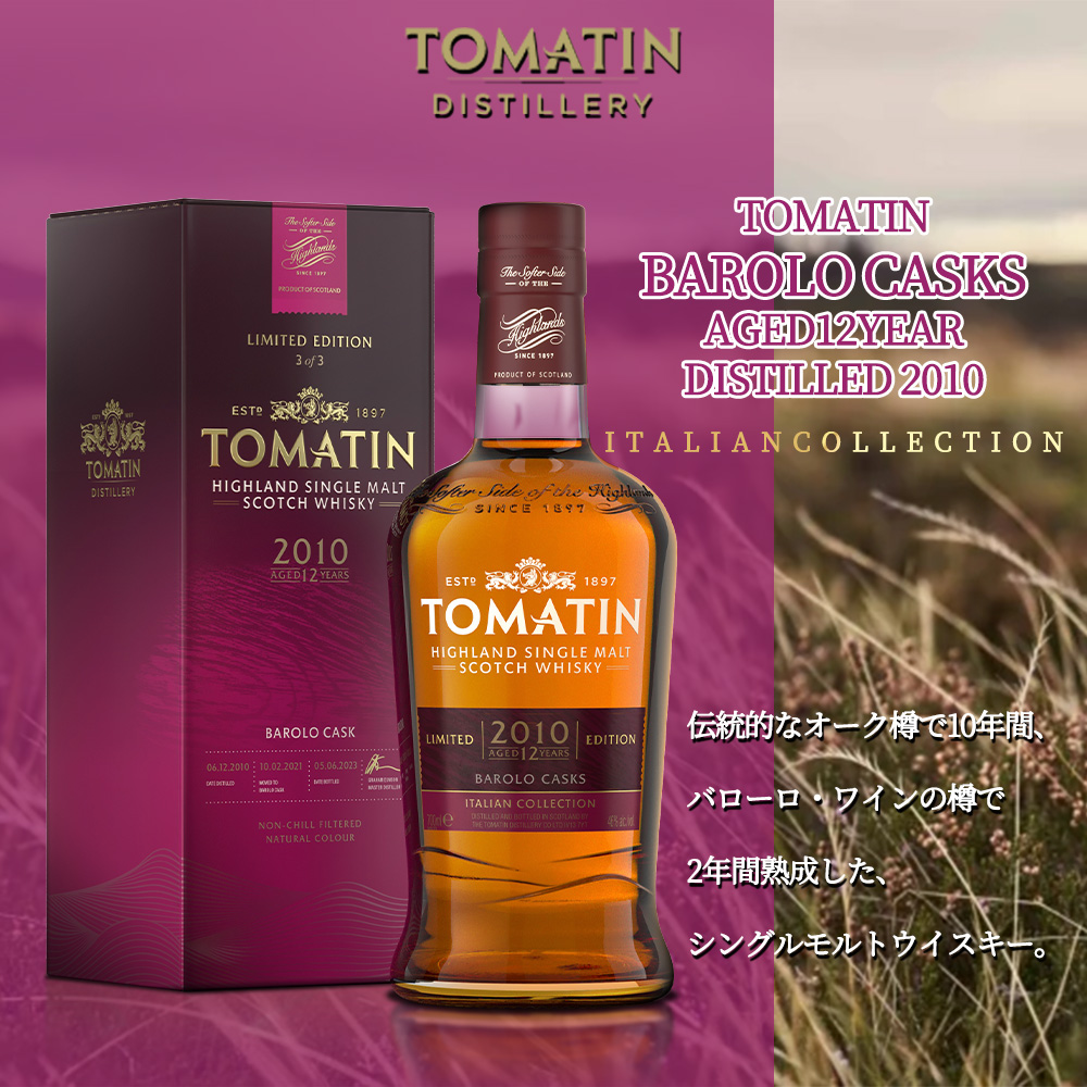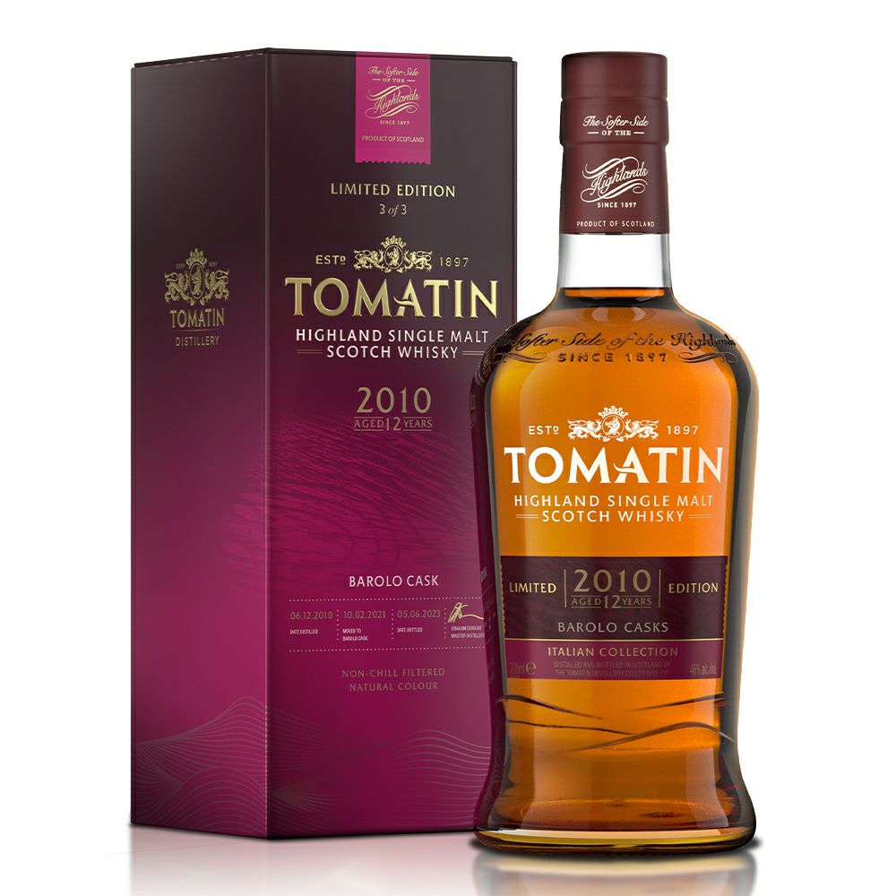 TOMATIN BAROLO CASKS AGED12YEAR DISTILLED 2010 ITALIAN COLLECTION HIGHLAND SINGLE MALT SCOTCH WHISKY NON CHILL FILTERED NATURAL COLOUR 700ml 46%