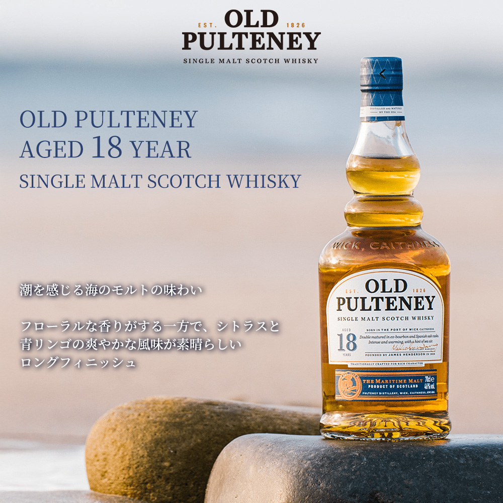 1826年スコットランド北部ハイランドの港町ウィックに創業した、最も古い蒸溜所の1つ!!プルトニー蒸溜所!!最北端に近い蒸留所でかつてニシン漁で栄えた町で、現在も海の文化が根付いています!!海辺の貯蔵庫で、潮風を受けながら熟成されるため“海のモルト”と称され、北海から吹く潮風と熟成環境が育む、塩気、オイリー、そしてスパイシーな風味が特徴的なシングルモルトを生産しています!!特徴的なボトル形状は、独特な形状のポットスチルに由来しています!!シングルモルト オールドプルトニー 18年!!はセカンドフィルアメリカンオークのバーボン樽で熟成後、ファーストフィルスパニッシュオークのオロロソ樽にてさらに熟成!!ディープアンバーカラー!!香りは濃厚で温かみがあり、チョコレートとクリーミーなバニラの香り、そしてリッチなハニーな甘さをすっきりとしたスパイスが和らげる!!花のようなフルーティーさからシトラスとアップルの爽やかさに変化していく!!味わいは潮を感じる海のモルト!!さらに溢れるほどのチョコレートの風味がはちみつがけのスパイスとクリスマスケーキと折り重なる!!フローラルな香りがする一方で、シトラスと青リンゴの爽やかな風味が素晴らしいロングフィニッシュに華やかさを与える!!