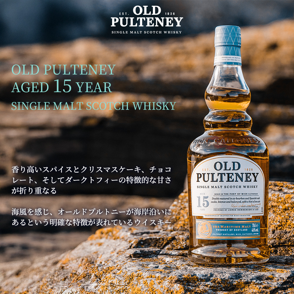 1826年スコットランド北部ハイランドの港町ウィックに創業した、最も古い蒸溜所の1つ!!プルトニー蒸溜所!!最北端に近い蒸留所でかつてニシン漁で栄えた町で、現在も海の文化が根付いています!!海辺の貯蔵庫で、潮風を受けながら熟成されるため“海のモルト”と称され、北海から吹く潮風と熟成環境が育む、塩気、オイリー、そしてスパイシーな風味が特徴的なシングルモルトを生産しています!!特徴的なボトル形状は、独特な形状のポットスチルに由来しています!!シングルモルト オールドプルトニー 15年!!はセカンドフィルアメリカンオークのバーボン樽で熟成後、ファーストフィルスパニッシュオークのオロロソ樽にてさらに熟成!!リッチアンバーカラー!!濃厚でバランスのとれた香り!!リッチなドライフルーツ、熟れたリンゴとシトラスがハニーの甘い香りとクリーミーヴァニラの香りとともに弾ける!!その後かすかなチョコレートとフローラルな香り!!味わいは香り高いスパイスとクリスマスケーキ、チョコレート、そしてダークトフィーの特徴的な甘さが折り重なる!!フィニッシュには海風を感じ、オールドプルトニーが海岸沿いにあるという明確な特徴が表れています!!