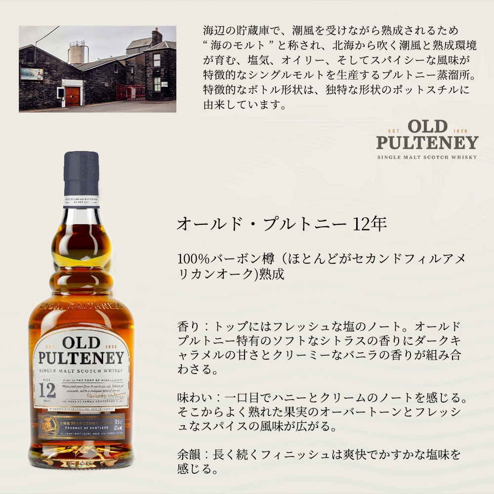 1826年スコットランド北部ハイランドの港町ウィックに創業した、最も古い蒸溜所の1つ!!プルトニー蒸溜所!!最北端に近い蒸留所でかつてニシン漁で栄えた町で、現在も海の文化が根付いています!!海辺の貯蔵庫で、潮風を受けながら熟成されるため“海のモルト”と称され、北海から吹く潮風と熟成環境が育む、塩気、オイリー、そしてスパイシーな風味が特徴的なシングルモルトを生産しています!!特徴的なボトル形状は、独特な形状のポットスチルに由来しています!!シングルモルト オールドプルトニー 12年!!は100%バーボン樽(ほとんどがセカンドフィルアメリカンオーク)でリッチで華やかな香り!!トップにはフレッシュな塩のノート!!オールドプルトニー特有のソフトなシトラスの香りにダークキャラメルの甘さとクリーミーなバニラの香りが組み合わさる!!味わいはフルボディーでスムーズ!!一口目でハニーとクリームのノートを感じる!!そこからよく熟れた果実のオーバートーンとフレッシュなスパイスの風味が広がる!!長く続くフィニッシュは爽快でかすかな塩味を感じる!!