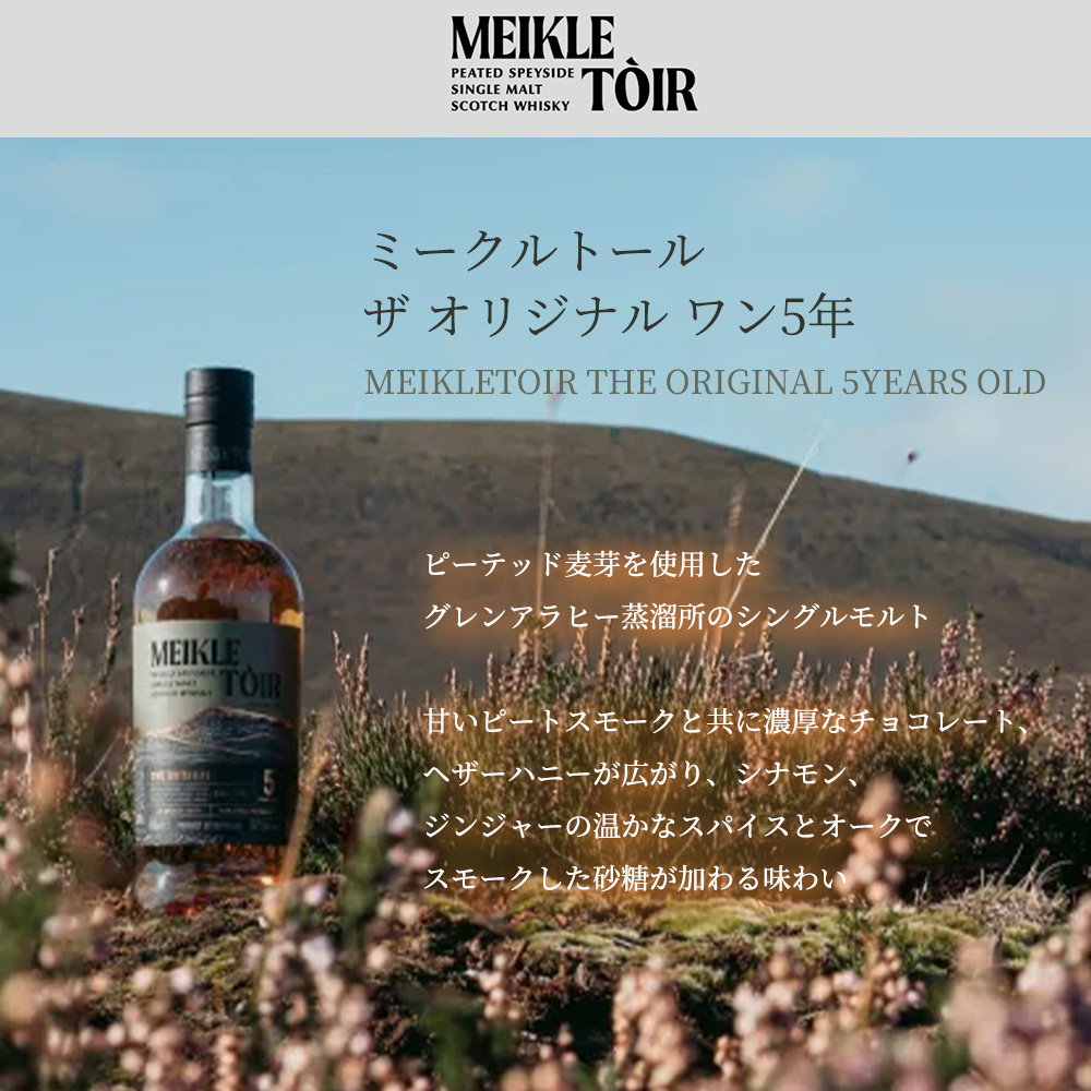 ミークルトール(Meikle Toir)はピーテッド麦芽を使用したグレンアラヒー蒸溜所のシングルモルト!!古いスコットランド語とゲール語を組み合わせた“大いなる追求”を意味するその名には、マスターディスティラーであるビリー・ウォーカーの長年にわたる試行錯誤と飽くなき探求、そして情熱が込められています!!