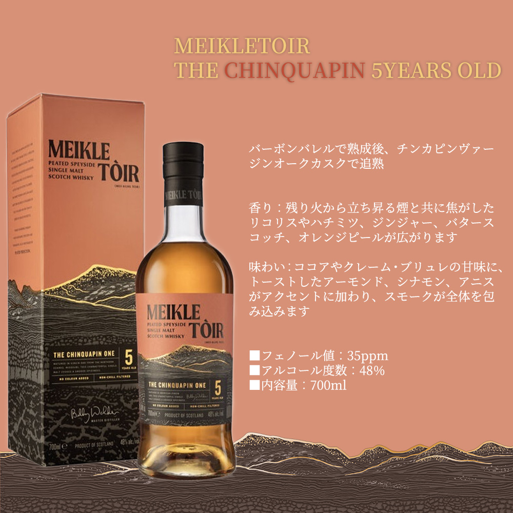 ミークルトール ザ・チンカピン ワン5年!!はフェノール値は35ppm!!バーボンバレルで熟成後、チンカピンヴァージンオークカスクで追熟!!最低熟成年数は5年!!香りは残り火から立ち昇る煙と共に焦がしたリコリスやハチミツ、ジンジャー、バタースコッチ、オレンジピールが広がります!!味わいはココアやクレーム・ブリュレの甘味に、トーストしたアーモンド、シナモン、アニスがアクセントに加わり、スモークが全体を包み込みます!!
